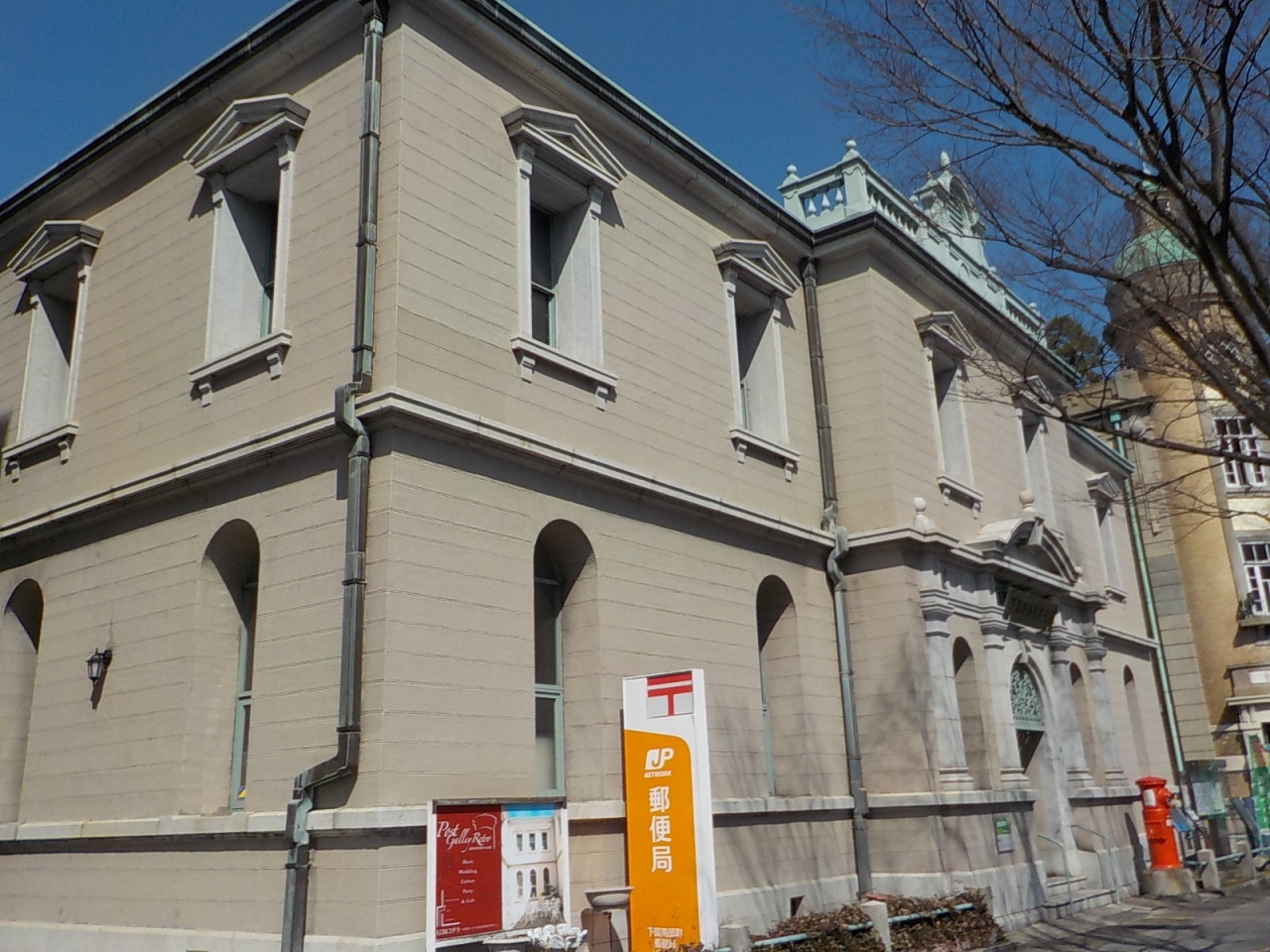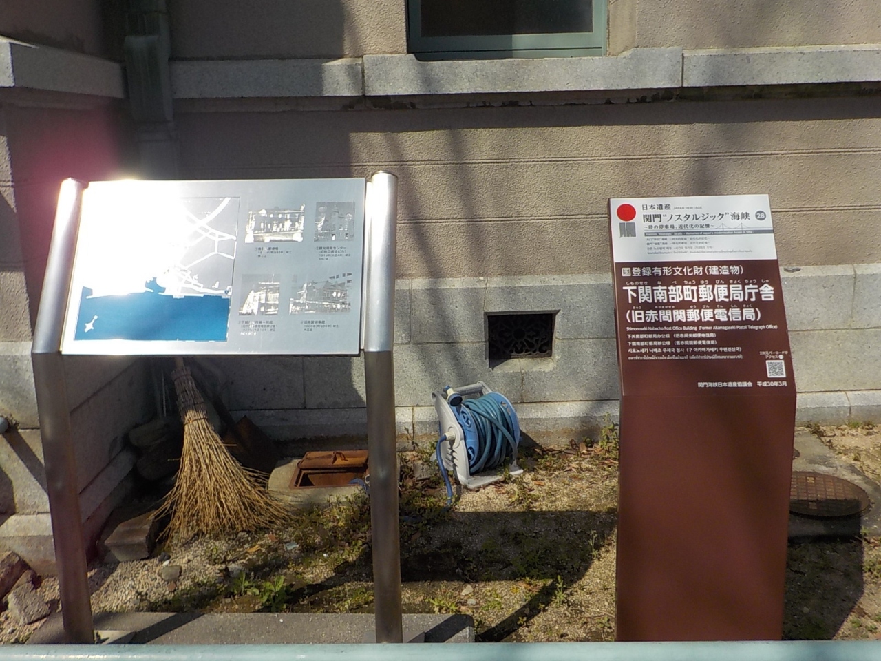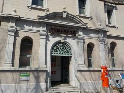 現在残されている郵便局の中で最古のものです。そしていまでも現役で使われているのが下関南部町郵便局庁舎です。東京駅を設計した辰野金吾の弟子である三橋四郎がこの建物を設計しました。左右対称の建物で左右に柱頭飾りのついた角付柱を配したルネサンス様式のものです。窓は1階部分にアーチを用い、2階は窓の上部に三角部分(ペディメント)があります。内部に入りましたが、お仕事中に邪魔をするといけないと思い、すぐに外に出ました。