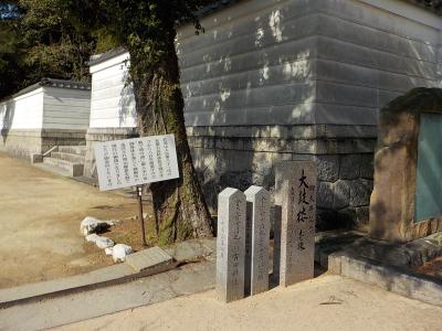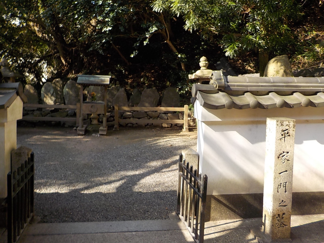 赤間神宮のすぐ西隣りにある安徳天皇阿弥陀寺御陵は、西日本にただ一つある御陵です。御陵は円墳のようで玉垣や土塀などで囲まれてほとんど何も見えません。壇ノ浦の戦いで平家が敗れることを覚悟したときに二位の尼に抱かれ、8歳の幼帝は入水され崩御されました。