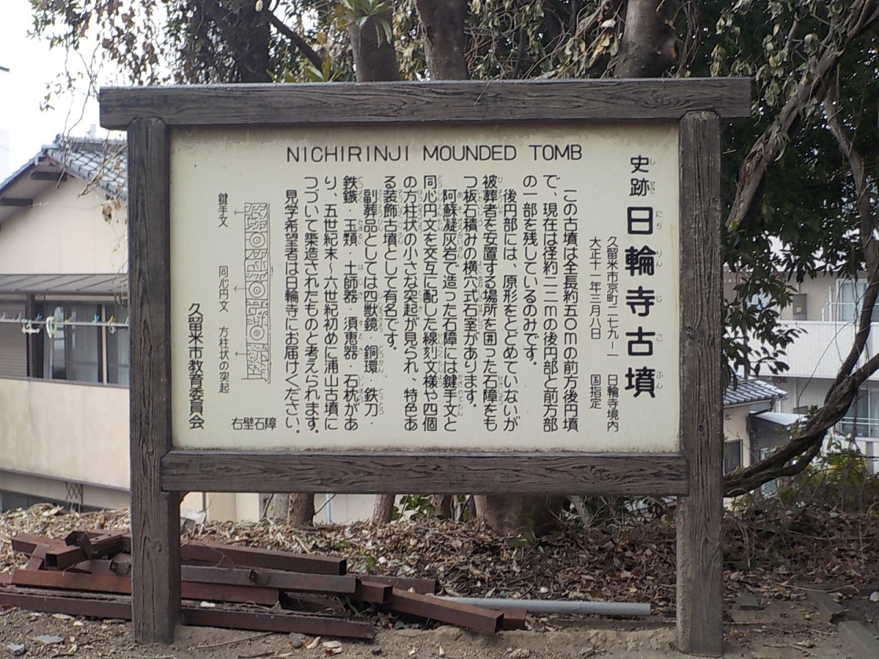 JR久留米駅から水天宮に向かう途中に立ち寄りました。前方後円墳ということでしたが、階段を上って古墳の後に登っても全容が掴めませんでした。解説を読んだら前方の部分が崩れているとのことでした。それでもよくわからなかったです。次回は何かのイベントがある時にお邪魔して、細かい解説を聞きたいですし、その時に石室まで見せてもらえればありがたいと思いました。なお、画聖坂本繁二郎の生家はすぐ近くにあり、子供の頃に日輪寺で遊んでいたと書いてありました。