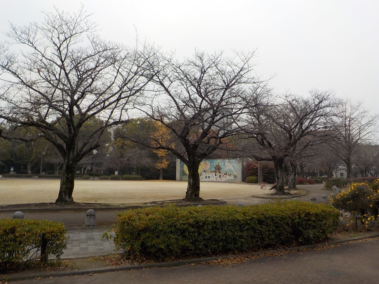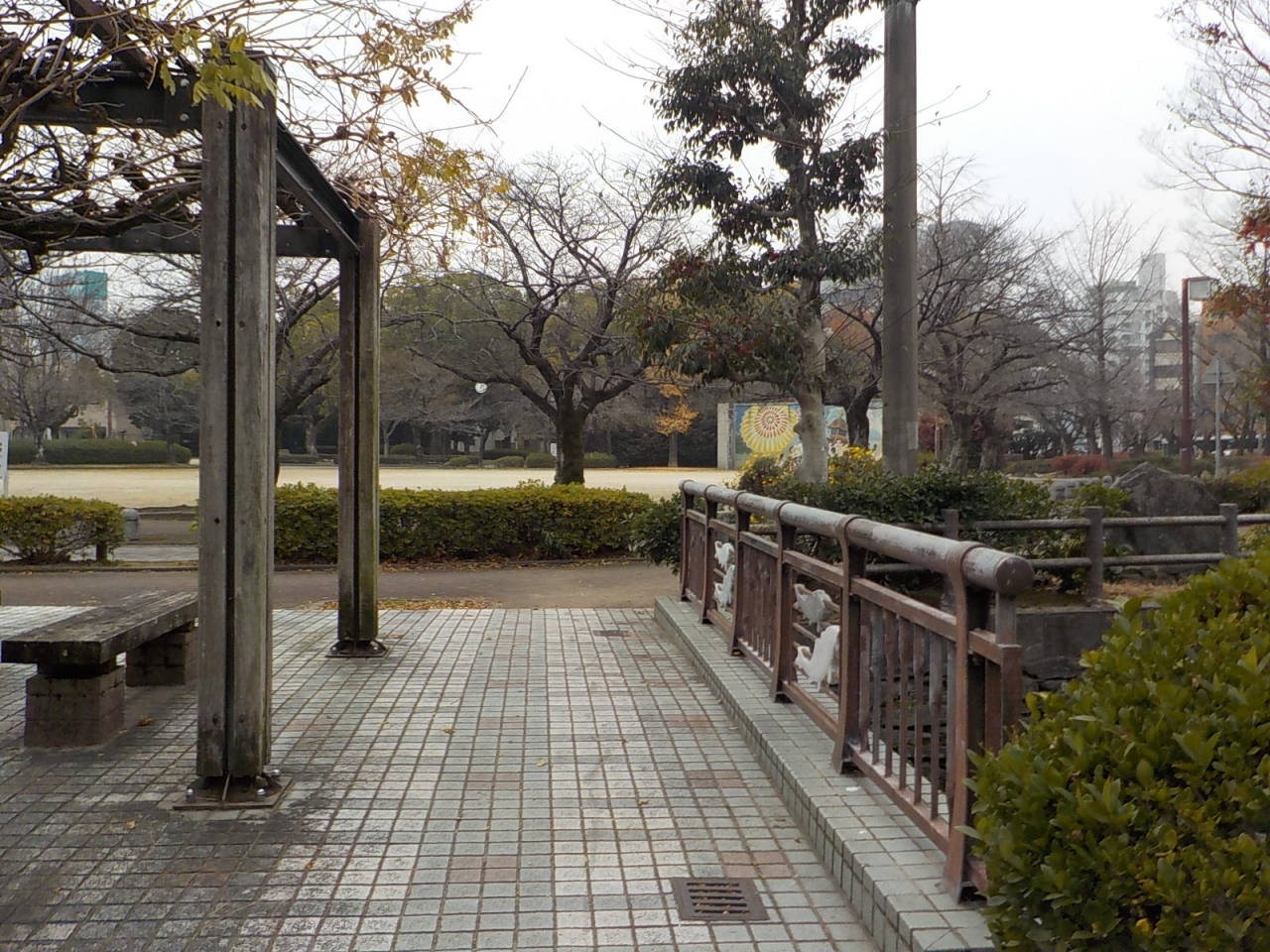久留米市役所の南側に池野川というあまり大きくない川が流れています。この川を少し上っていくと三本松公園があります。公園の一角に「久留米水の祭典」の様子をタイルを使って描いた絵がありますが、それ以外はあまり特色のない普通の市民公園です。ただこの公園はアクセスが便利なので、桜の花がライトアップされる時期には多くの人で賑わいます。