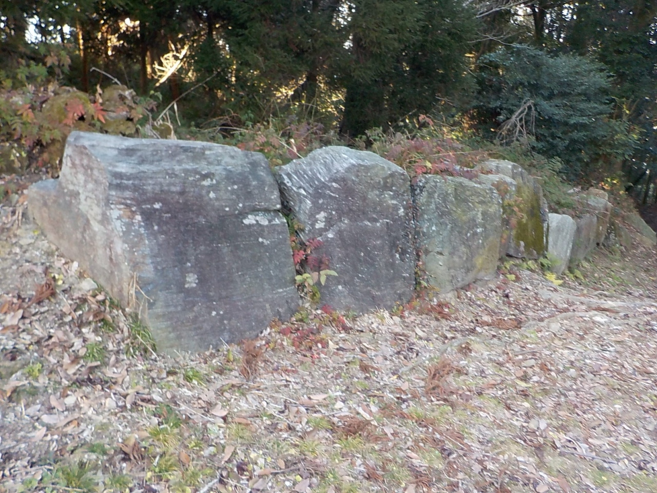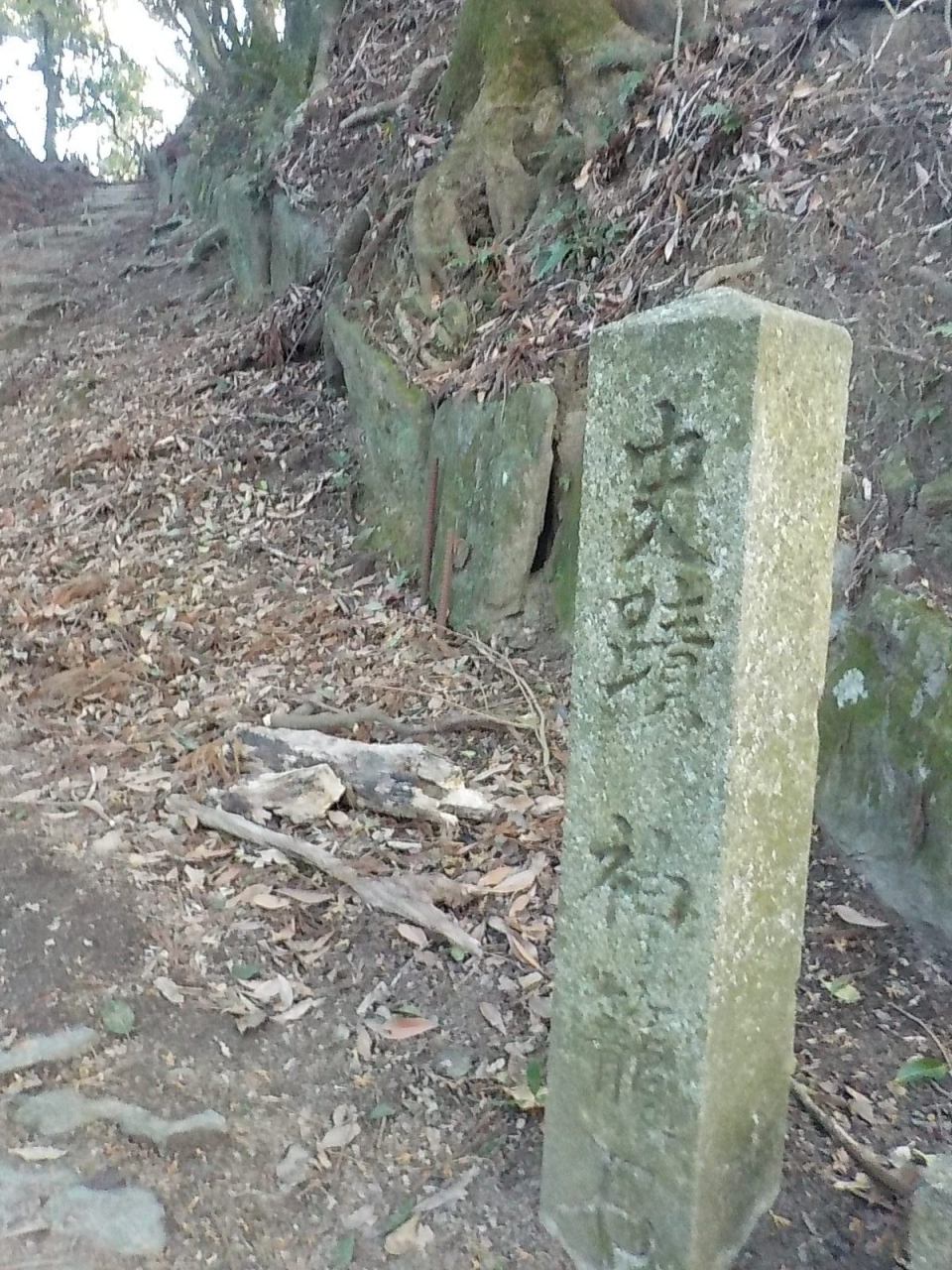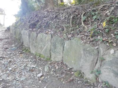 高良山にある神籠石は山城の跡になりますが、長さ1.5㎞に渡って切り石が並べられています。もともとは「鬼の作ったもの」だとか「結界」だとか諸説あったのですが、現在では山城の址となっています。全国に先駆けて、高良山の列石が神籠石という名が付けられました。どのようなものか興味があったので、簡単にアクセスできそうな高良大社本殿の裏にあるものを見に行きました。本殿の左手から耳納スカイラインに抜ける舗装された坂道があります。少しの登ると、右側に神籠石の存在を示す石の標識があります。ここから50mも山道を登ると切り石と思われる石の列があります。色々なところで神籠石の話を聞きますがb、初めて実物を見ました。