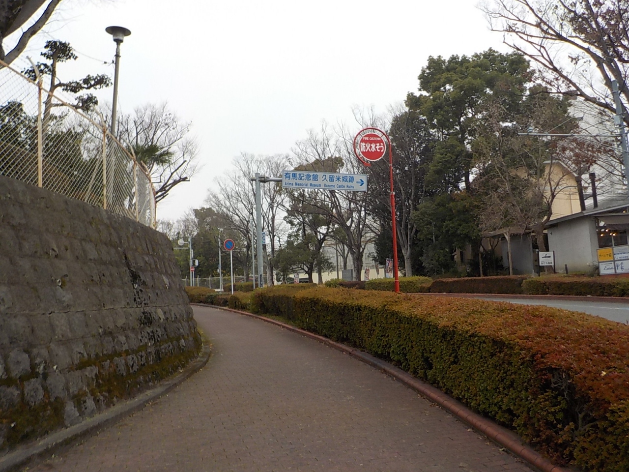 - JR久留米駅からブリヂストン通りに入ると徐々にゆるい勾配の下り坂になります。旭町からは平坦な道になります。