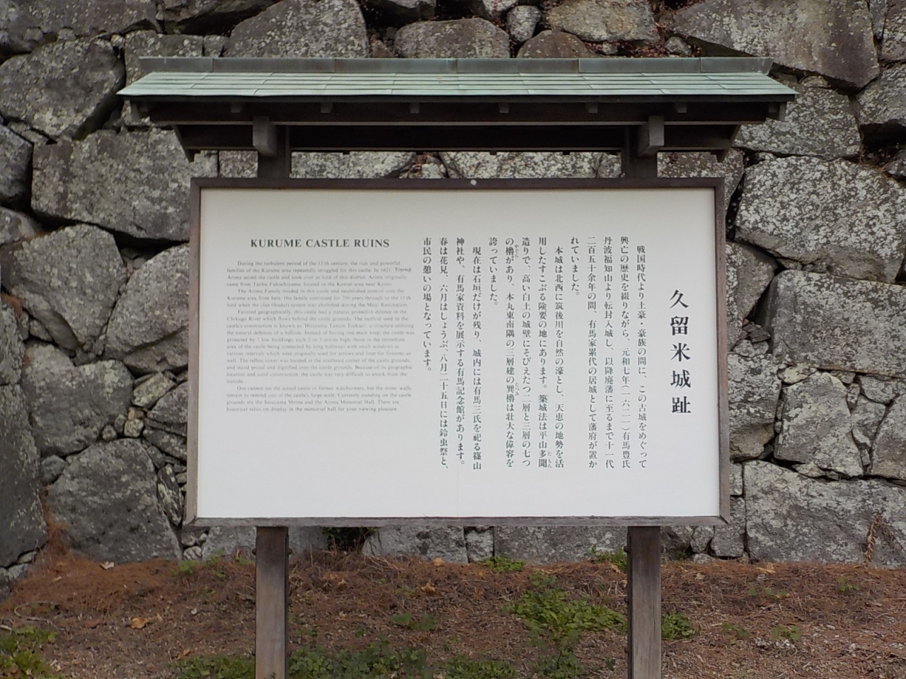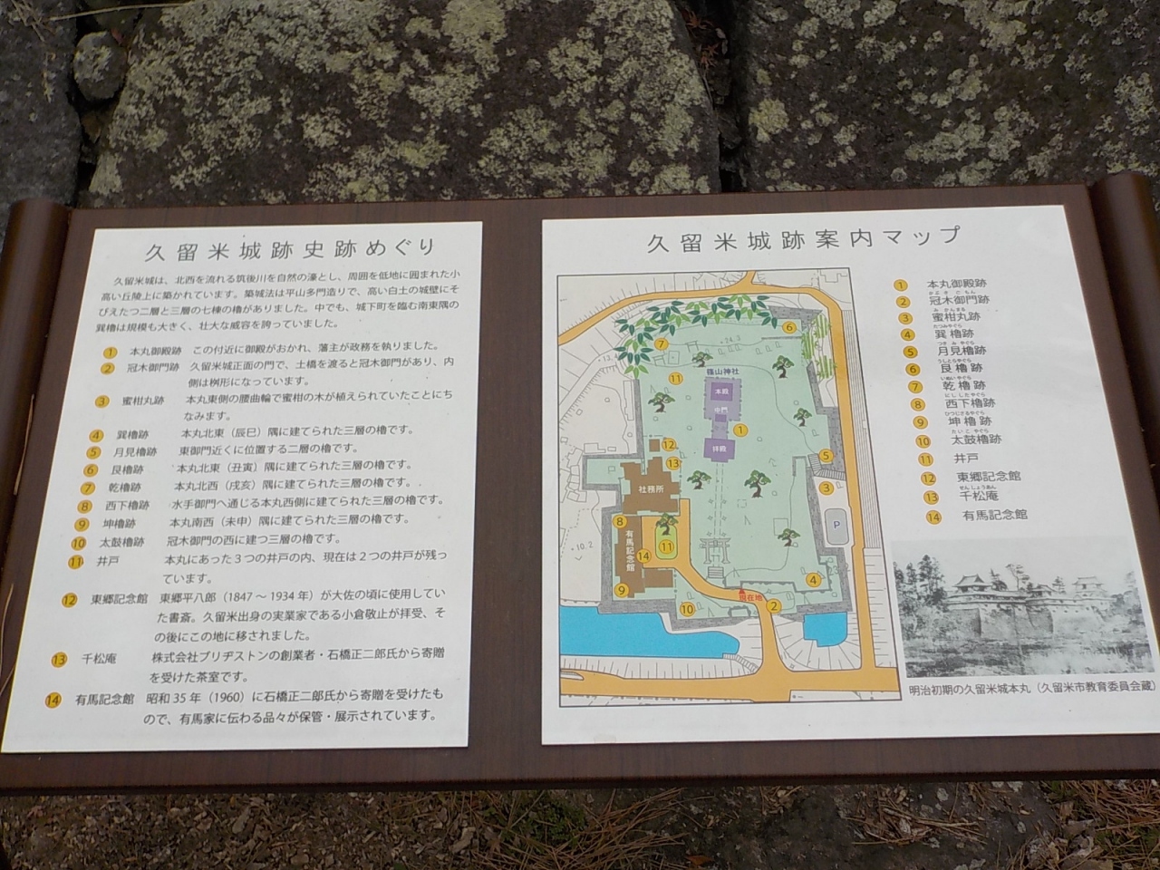 江戸時代の初めに田中家の断絶の後に久留米に移封された有馬豊氏を藩祖として、江戸時代末期までの約250年間この地を治めた有馬氏の居城跡です。ブリヂストン通りの分岐から久留米城跡に向かって真っすぐ歩いて行くと二の丸跡があります。さらに進むと立派な石垣が見えてきますが、ここが内堀になります。いよいよ石垣の間を縫って続く急な坂道をしばらく上ると、急に視界が開け本丸跡や藩祖有馬豊氏を祀る篠山神社があります。左手には有馬氏の歴代藩主の武具や所蔵の品々、藩政資料を展示する有馬記念館があります。