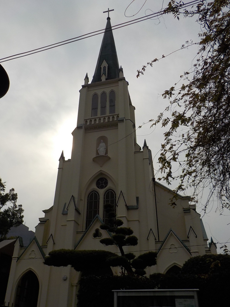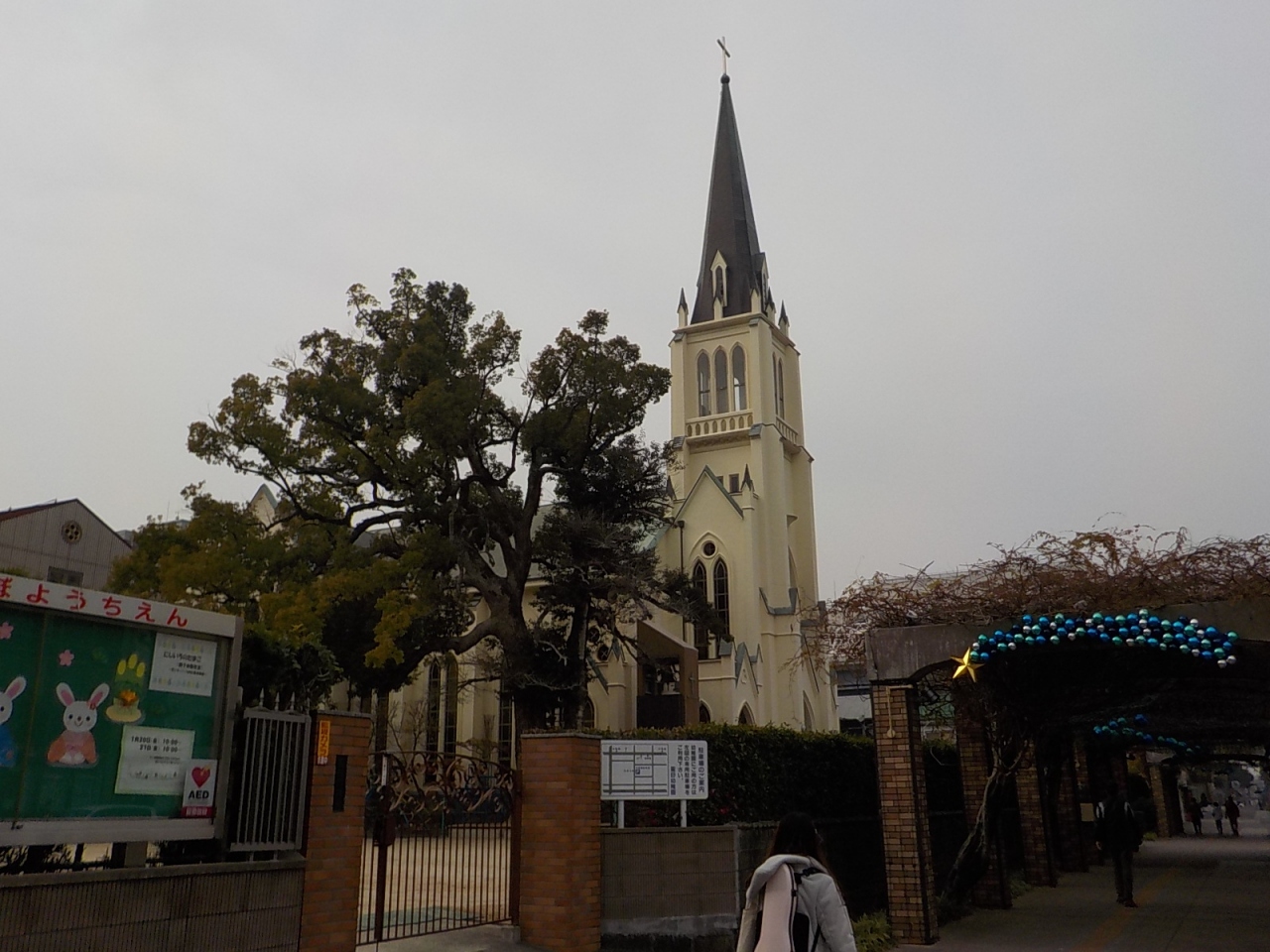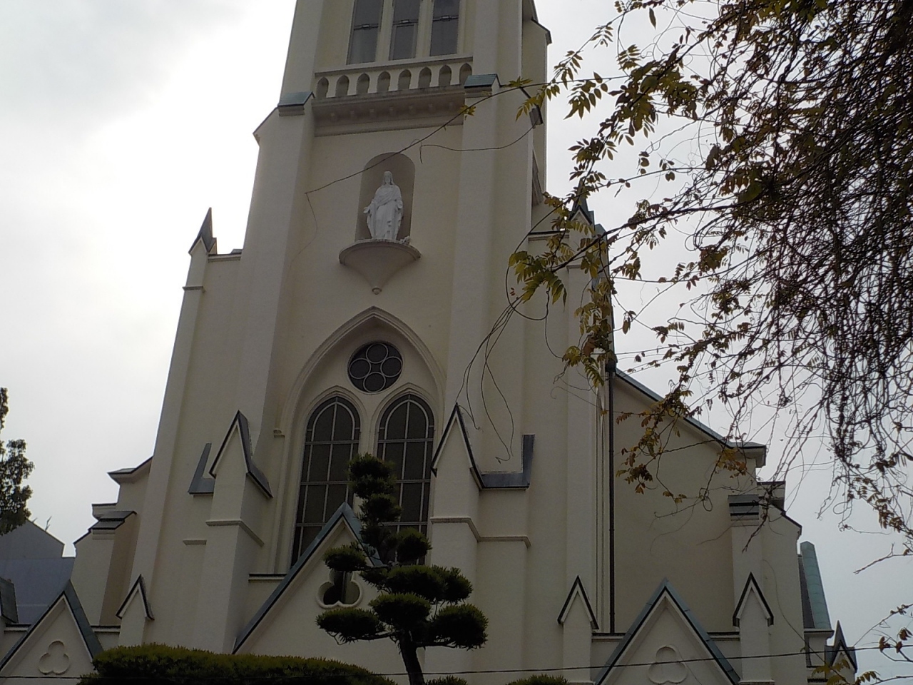 久留米市の明治通りを歩いていると、あまり高い建物がないのでこの教会の尖塔がひときわ目立っています。この教会の起源は。久留米が有馬藩になる前に毛利家が領主であった時代です。ということは江戸時代以前のことです。戦前は時計台付きの赤煉瓦の教会でしたが、空襲で焼失し、1955年(昭和30年)に現在の聖堂が再建されました。訪れた日はミサもないので教会の門扉は閉じられていましたが、併設の幼稚園から子供たちの元気な声が聞こえてきました。