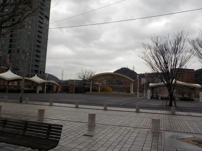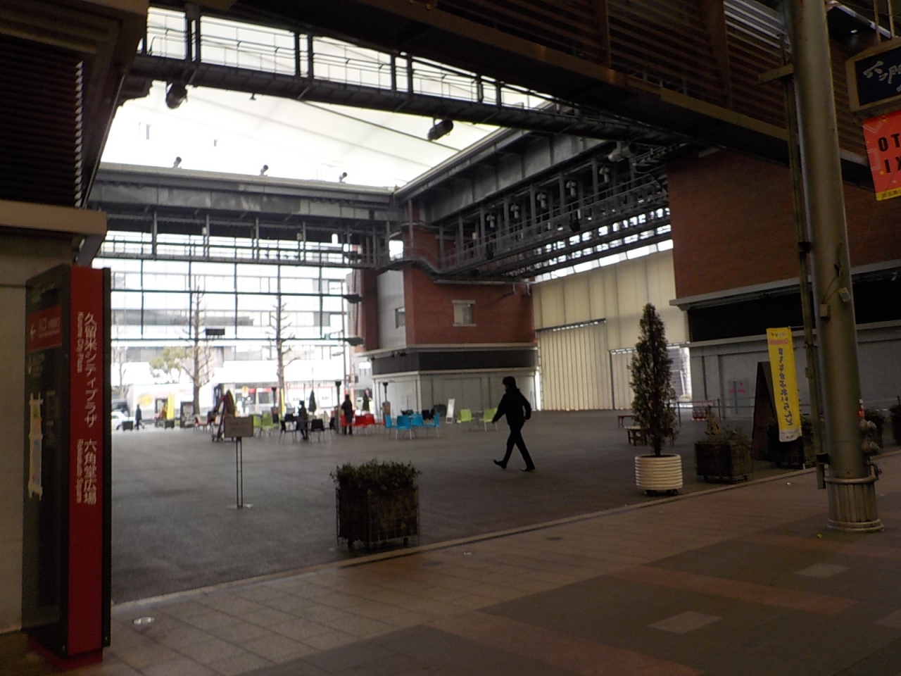 西鉄久留米駅からほとめき通り商店街を歩いて行くと8分位で到着します。街中の広場としてはかなり広いものです。目測では40m位あると思います。屋根はかなり高く日差しを和らげて通す幕のようなものでできていますので、明るく開放的ですし、雨が降ってもイベントができます。幅10mほどのステージがあったりするので利用しやすい広場と思います。また片隅にはFM放送のスタジオもあるので、イベントがなくても別の利用ができるようです。