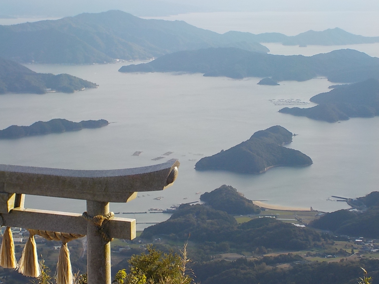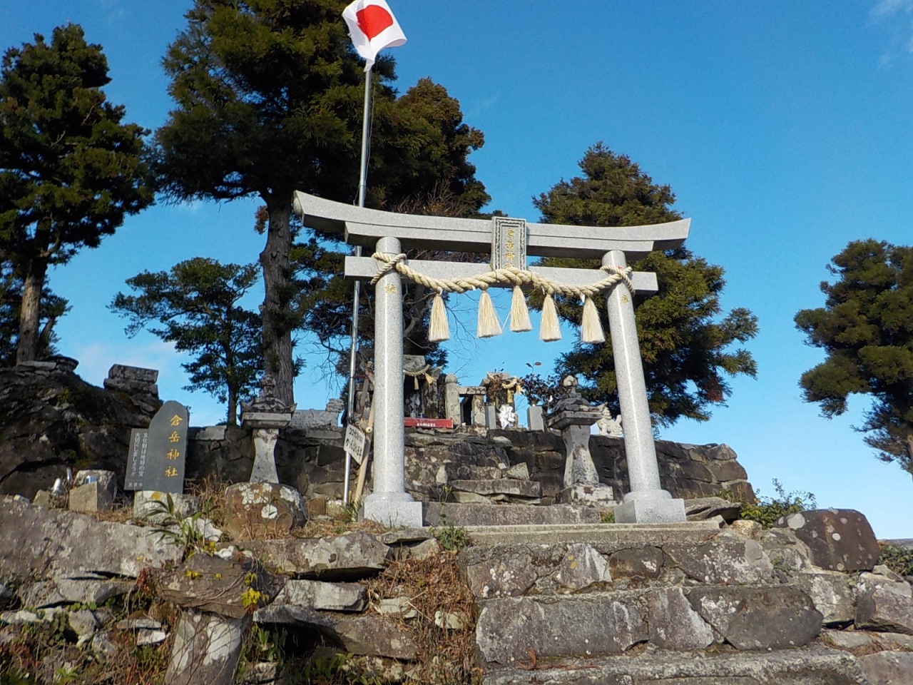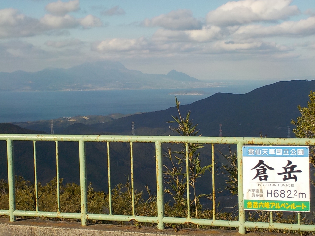 倉岳は天草上島の南東にあり天草諸島の最高峰、標高682mです。車を利用して頂上直下まで行くこができます。倉岳の南側にある天草市立倉岳小学校側から舗装道はありますが、道幅が狭く離合できないところが多いので、倉岳北側の県道34号線から南に向かう舗装道がはるかに利用しやすいです。いずれにしても十分安全に注意してください。頂上には漁民と航海の安全を祈願して創建された倉岳神社があります。そこから南側に広がる八代海の景色は、島が点在して非常に綺麗です。