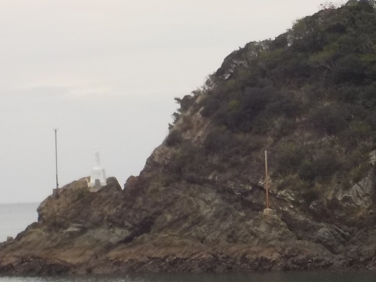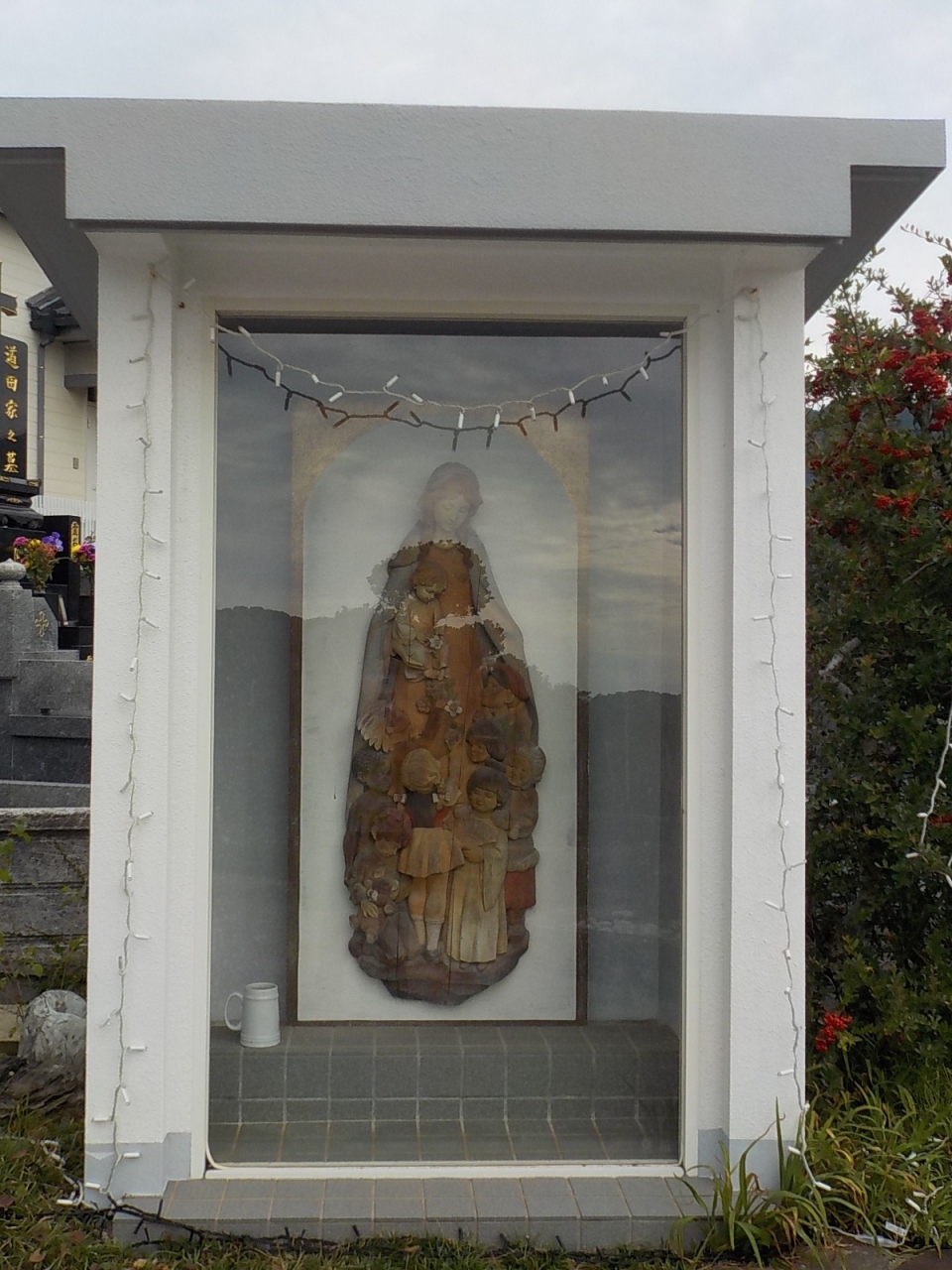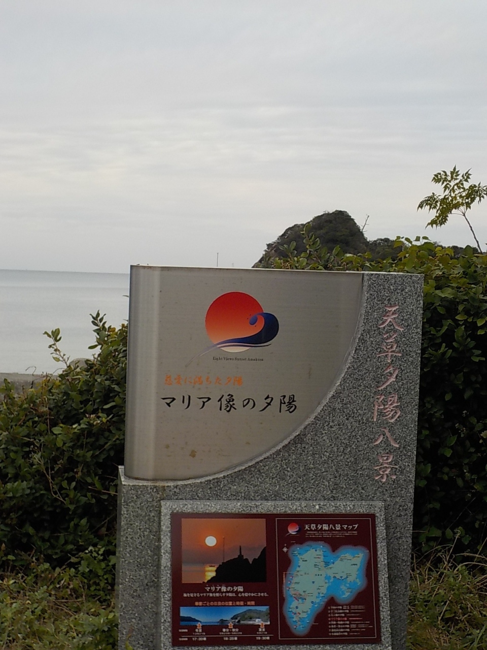 津集落を抜けて、しばらく歩くと道路が少し右に曲がるところに「海上マリア像」の表示板があります。そこから少し階段を下りると展望台がありますが、海を隔てて岬に立つ白亜のマリア像はかなり距離があるので、普通のカメラやスマホで望遠撮影してもなかなか難しい距離です。マリア像は往来する船の安全を祈っているかのように見えました。そこからもう少し海岸線を歩いて行くともっと近くに海上マリア像が見える場所はあります。