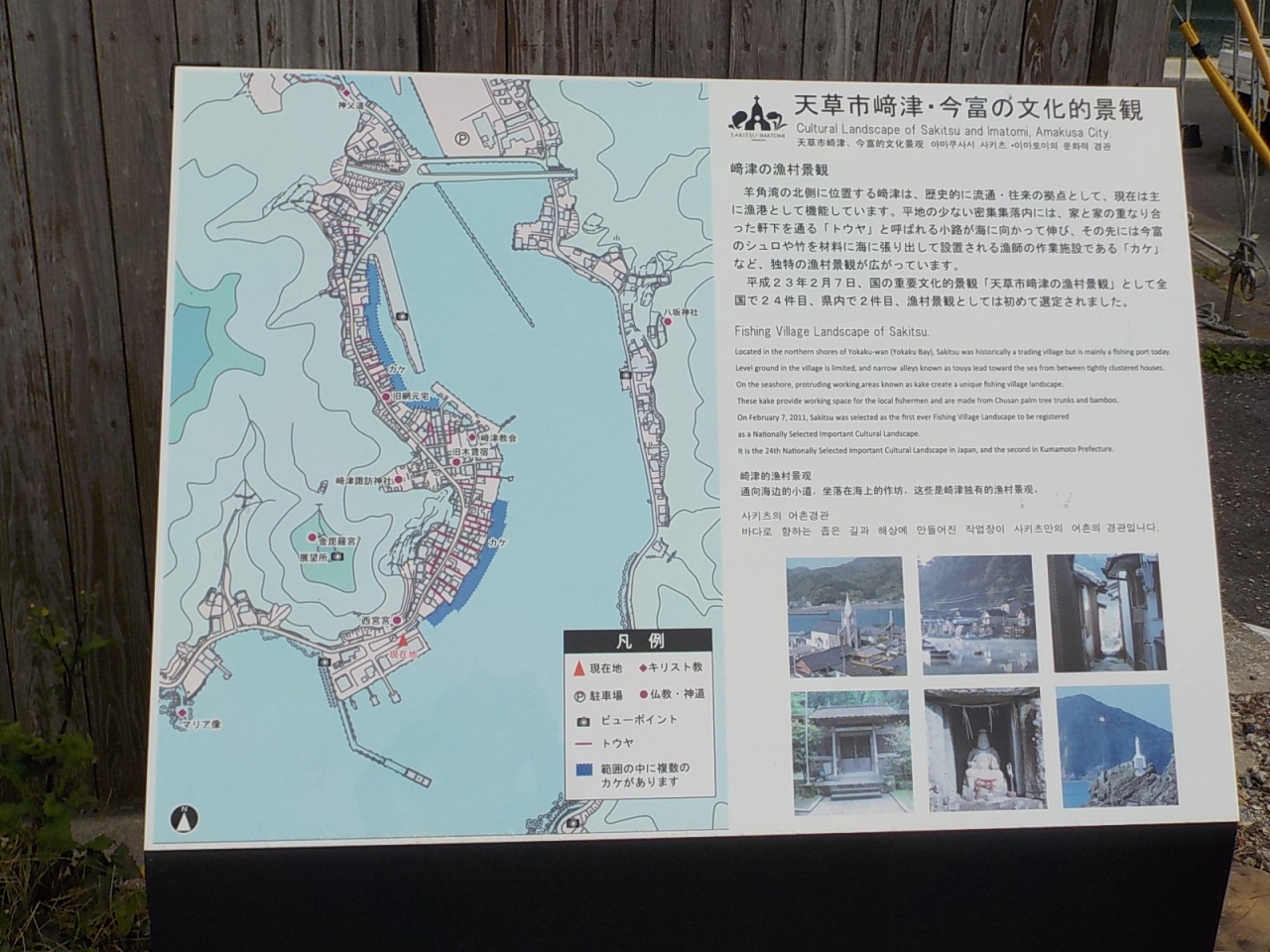 国道389号線から左折(南方向)し、崎津集落を抜ける細い道を崎津集落の方に入って行きます。右手に崎津諏訪神社がありますので分かりやすいです。車を駐車すると他の車の通行を妨害することになりますので、少し先の無料駐車場に車を駐車して、来た道を戻ります。この案内所から崎津教会に入って行けますが、教会に向かう前にここで情報集めです。ついでに拝観マナーも確認します。教会内はミサが行われている時間ではなかったので、拝観できますが靴を脱いで入ります。内部は写真撮影禁止です。ついでに崎津集落の地図もいただきました。おかげでスムーズに集落内にある崎津諏訪神社、海上のマリア像にも順序よく行くことができました。また崎津集落を上から望める展望台のことも教えてもらえました。素晴らしい景観がありましたよ。
