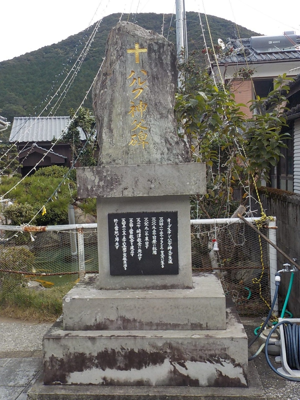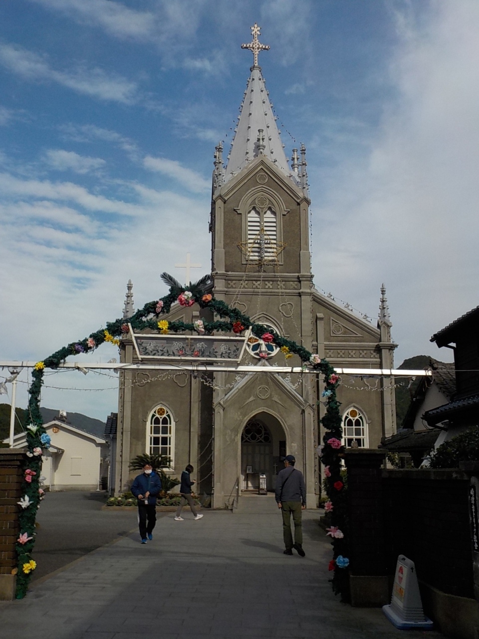 「長崎と天草地方の潜伏キリシタン関連遺産」のひとつです。天草から約2時間近くのドライブです。崎津集落手前にはかなり長いトンネルがありますが、トンネルを抜けtると左手に教会が見えます。狭い集落内の道を注意しながら走ると数か所の無料駐車場があります。観光案内書に行き、情報を仕入れて教会に向かいます。教会は靴を脱いで入る形になります。内部は撮影禁止ですから写真はありませんが、畳が床に敷き詰められていました。このヨプな教会で初めて見ました。キリスト教の禁教が解かれた後、1888年にもとの教会が造られました。現在のものは昭和9年、仏人宣教師ハルブ神父の時代に建てられたものです。崎津諏訪神社の裏山に上って集落を見ましたが、海とよくマッチした景観の教会でした。
