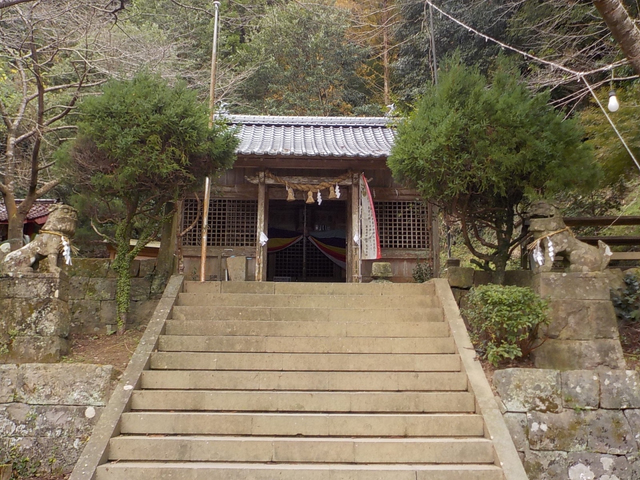 海上交通の安全と豊漁を祈願するために江戸時代初期に創建されたそうです。天草市内で最も古い神社で津集落の鎮守社です。キリスト教が禁教であるとされていた時代には、津集落にいた隠れキリシタンは、カモフラージュするためにこの神社の氏子となって参拝していました。拝殿の前では心の中で「オラッショ(キリシタンの用語で「祈り」の意味)」を唱えていました。この神社は隠れキリシタンが持っていた信仰の品々を差し出すように指定された場所でもあります。