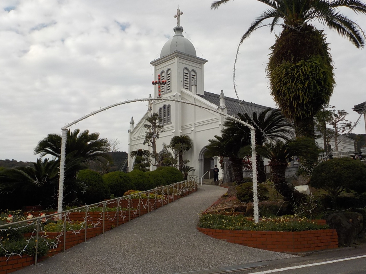 キリスト教が認められてから、天草で初めて建設された教会です。現在の礼拝堂の建物は昭和の初期に仏人宣教師ガルニエ神父が地元の方々の協力を得て建設されたものです。この神父は天草のキリスト教伝道に一生を捧げた人です。崎津教会のゴシック様式の教会とは違って、どこか優しさを感じるロマネスク様式のものです。天草の陽光に映える真っ白な建物でまばゆいばかりです。教会内部に入るとステンドグラスから入って来る光には優しさがあります。