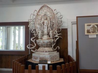 白地湖を訪れた時に印象的なドーム型礼拝堂の教会を見つけたので行ってみました。敷地内に入って声をかけさせていただきましたが応答がなかったので、勝手に礼拝堂に入るのもはばかられ、ドーム型礼拝堂を外部から拝見させていただきました。礼拝堂内部が見られなかったのが残念です。敷地から出ようとしたら白地湖通り沿いにある塀の所に中浦ジュリアンの像を見つけました。天正遣欧使節の4人の少年の一人です。帰国後は状況が一変してキリスト教が禁教となった時代に大変苦労したはずです。自分の乏しい知識では中浦ジュリアンは口之津を拠点として困難な時代にもかかわらずキリスト布教活動をしたようです。
