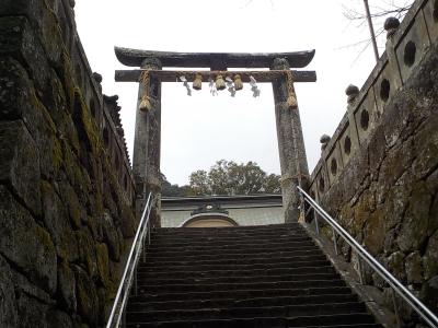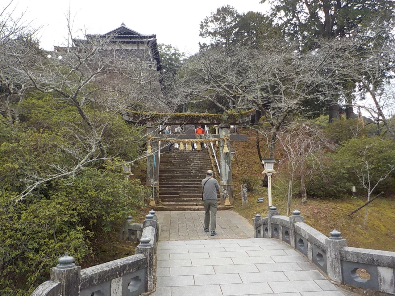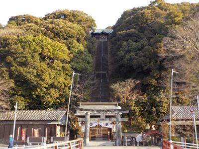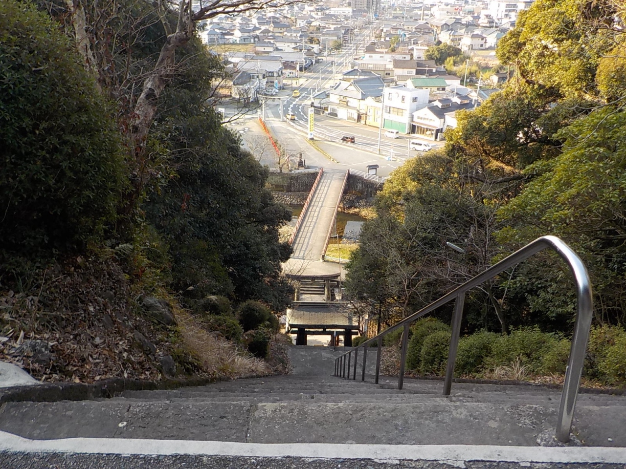 小城市の城山という小高い山にある神社です。有名な小城羊羹の本店前にある一の鳥居から見ると見上げるような石段が本殿まで続きます。一の鳥居を潜り、橋を渡ると神門があります。ここからは石段が始まります。数え間違ったかもしれませんが154段ありました。50段ほど登ると踊り場のようになっていて休憩はできます。後ろを振り返ると小木の町、眼下には小城羊羹本店が見えます。やっとのことで本殿まで到着すると絶景が見られます。下山はこの階段は手摺はありますが非常に急で危険ですから、本殿右手から下山道(こちらも急なところはあります)があるのでそちらを利用するのがよいと思います。もとの神門まで戻ってこられます。