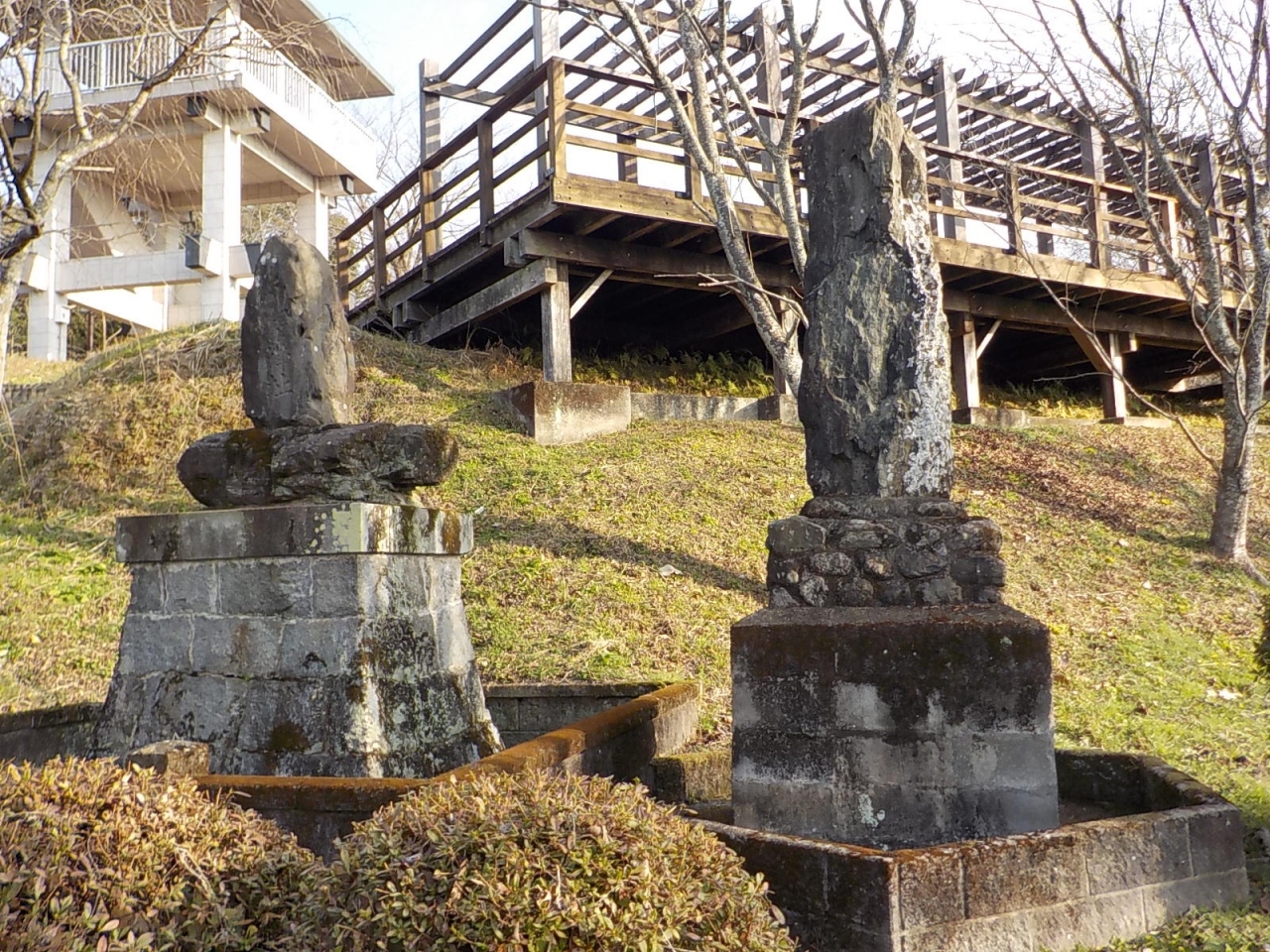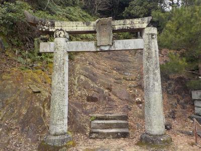 須賀神社の急な長い階段を上って、神社本殿右側の山道を行くとあります。