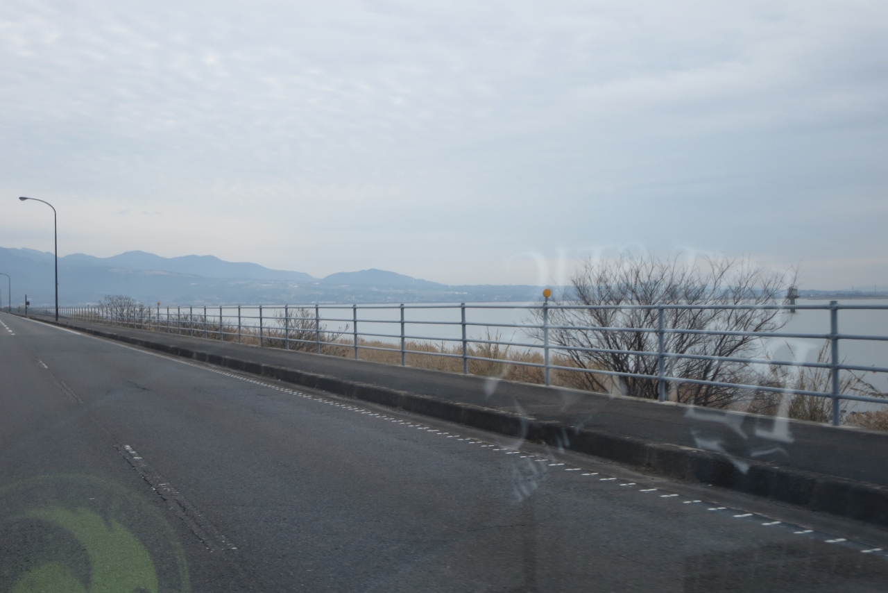 諫早湾干拓事業で造られた潮受堤防上に道路を建設したものです。佐賀県鹿島市と長崎県島原市を結ぶ高低差もない直線道路です。およそ7㎞ありますが、道路の東側にある堤防が道路面より高いので何も見えません。西側は潮受堤防で閉め切られた諫早湾が見えます。諫早市中心部の混雑を避けることができるので、距離と時間を節約できます。