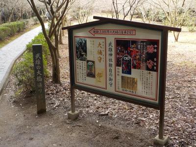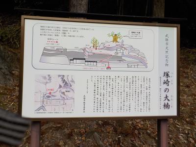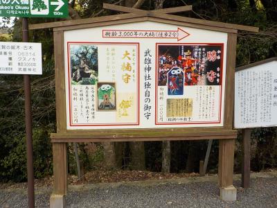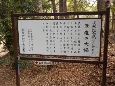 以前は大楠の近くまで行けましたが、現在は見学者の立ち入り禁止範囲が広げられています。老木であるのでその保護措置のようです。武雄神社にお参りしたあと本殿左手からコンクリート舗装された歩道を歩きます。5分もかかりません。全国でも有数の巨木(第7位)だそうです。樹齢3千年以上。樹高30m、幹周り20m、枝張り東西30m、南北33mあるそうです。武雄神社のご神木です。根元がコブになったような巨木で、幹の中央に空洞があります。近くに立ち入れないのでよく見えませんが、説明によるとこの空洞は12畳の広さがあるそうです。