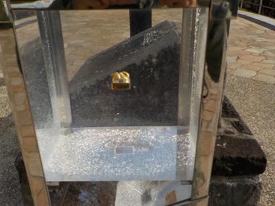 ちょっと場所が分かり難いです。名島海岸の綺麗に整備された夕日尾道を北に向かって歩いて行き、名島神社の方に曲がるところから、松の低木をの間から海岸に下りたところにあります。説明を読むと樹木が化石になったものです。これが9個に分かれて並んでいます。海水面のすぐ上ですから満潮時には水没する可能性があります。神功皇后が三韓出兵するときに使った船の帆柱が化石になったものだといも言われているので、帆柱石と呼ばれています。足場のよいところではなく、すぐ横が海ですから近づくときは十分に注意が必要です。