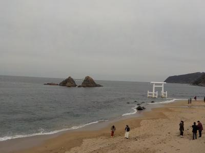 - 水の綺麗な玄界灘の砂浜にある白亜の鳥居と沖合にある夫婦岩の景色は最高に綺麗です。