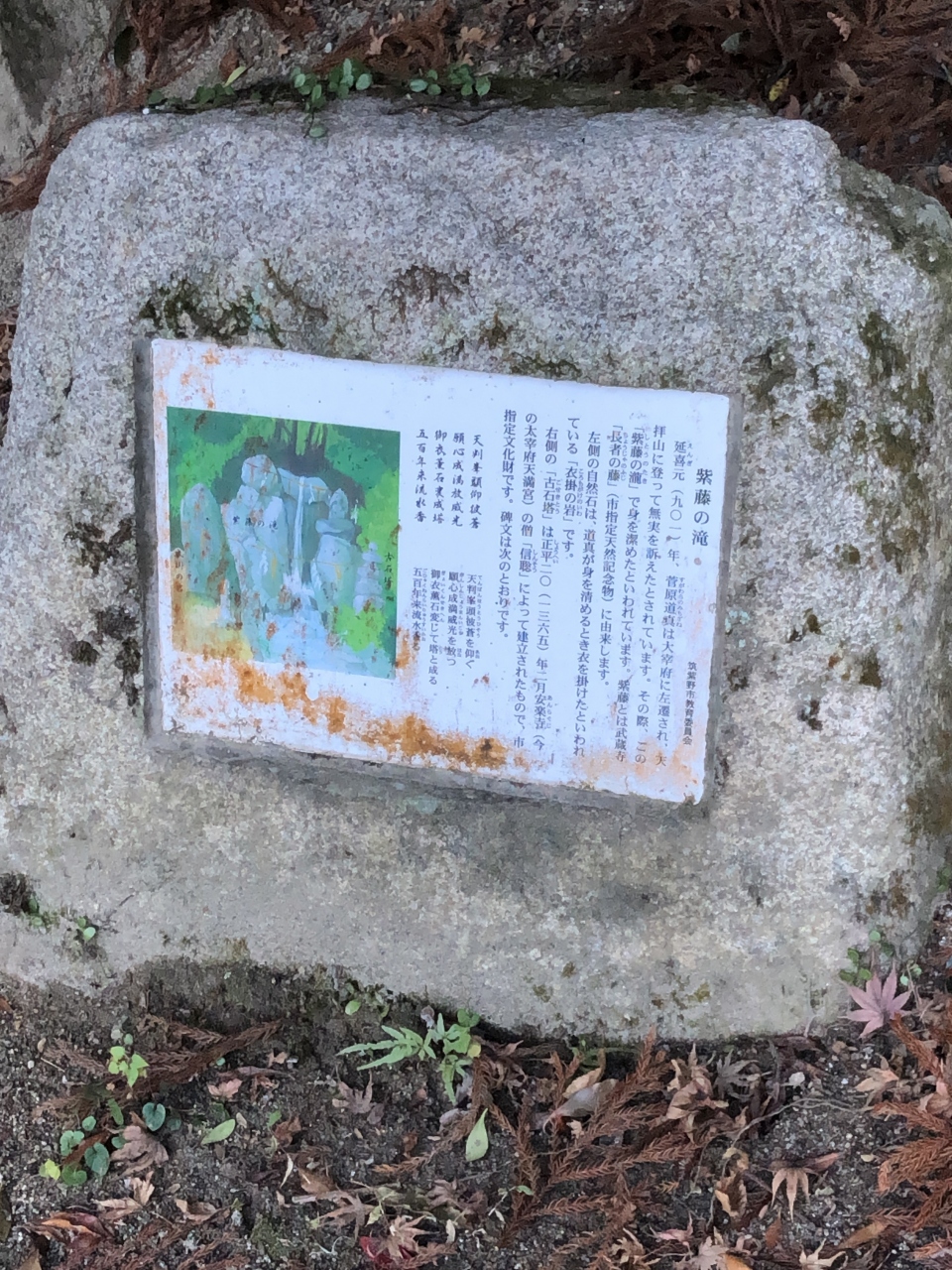 筑紫野市の武蔵寺に行ったら是非立ち寄ってほしいスポットです。菅原道真公が疑いをかけられて身の潔白を訴えるために天拝山に登りますが、その時に身を清めたと言われる滝です。武蔵寺の山門をくぐらず手前にある細い道を少し歩くとあります。石鳥居と注連縄が張ってあるのですぐに分かります。この奥に紫藤の滝があります。滝は正面から見にくいので、左手から見ると水の流れもよく見えます。また禊の時に衣をかけた衣掛岩もあります。