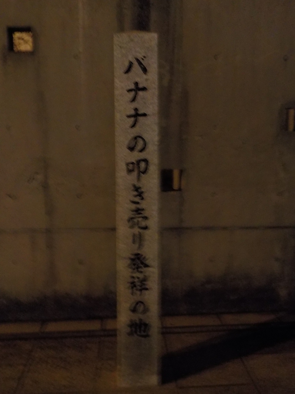 門司港の名物の一つはバナナの叩き売りです。「さぁさ買うた、さぁ買うた」で始まるリズミカルな節で始まるバナナの叩き売りは年配の人には懐かしいものです。子供の頃にはバナナが貴重品であった時代なので、ちょっと感傷的にもなります。その石碑がJR門司港駅前の広場の東部にあります。すぐ横は旧JR九州本社ビルです。夜に訪問したので探すのに手間取りました。