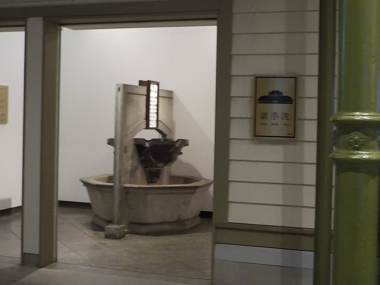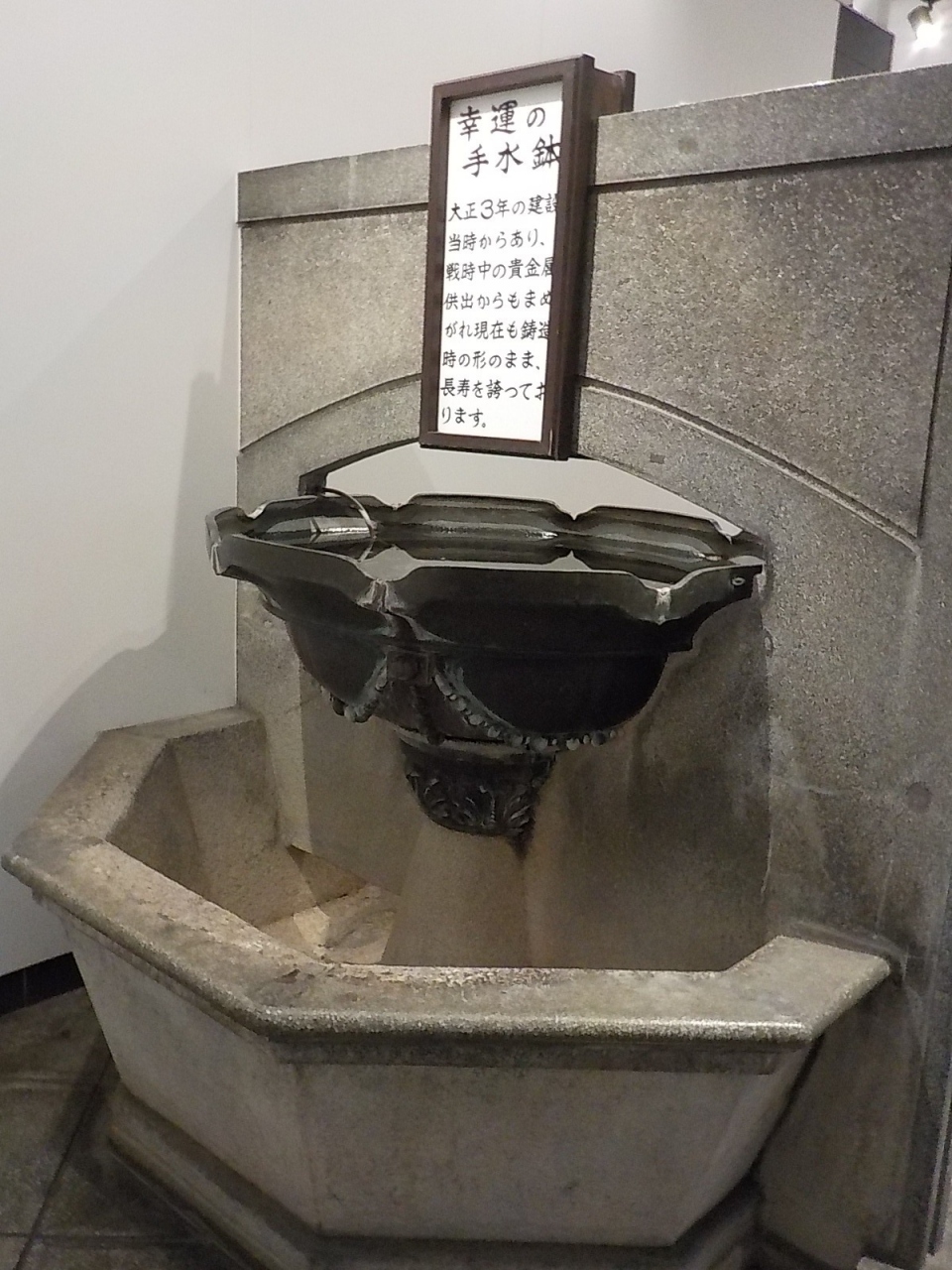 JR門司港駅のトイレ入口の正面にある手洗い場です、多分青銅製だと思います。戦時中にあった金属供出命令で取り外されることになりそうでしたが、それを免れたのでこの名が付きました。直径1mくらいでですが、すっかり黒ずんでいます。白い板にはこの手水鉢に説明が書かれています。
