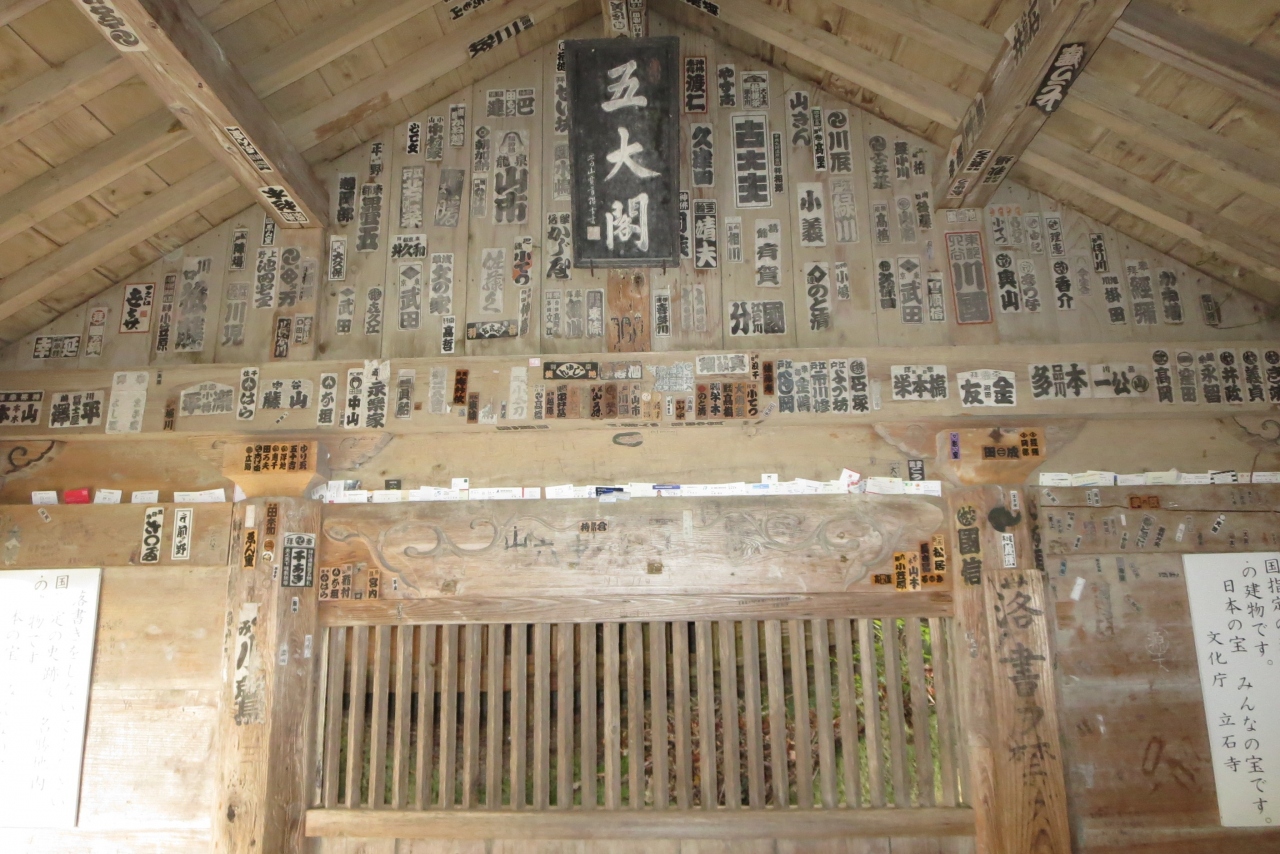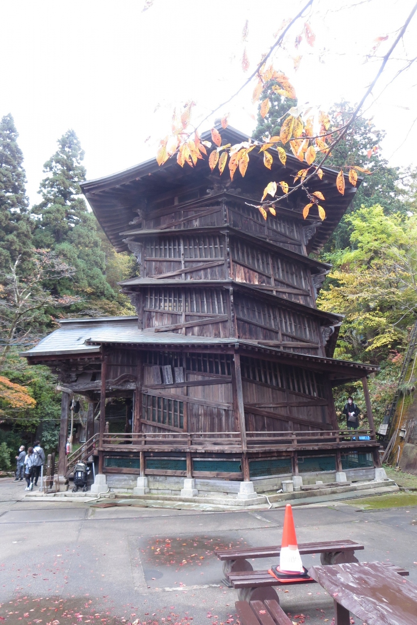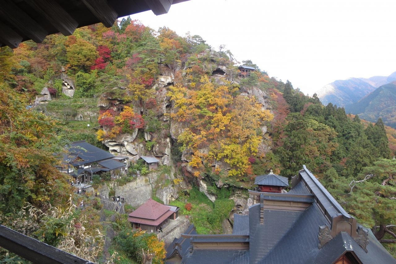 山寺でどこがお薦めと言われれば、この五大堂を言う人が多いと思います。長い石段の参道を登って50分近くかかります。参道のすこし左手に小さな赤い納経堂が目印になります。開山堂を過ぎるとすれ違いができない狭い階段になりますが、そこを過ぎると五大堂になります。山寺のベストビューポイントです。百丈岩という岩の上に建てられていて、お堂の中に入って景色を見ると鳥になったような気分です。長い階段を上ってきたことに対するご褒美でしょうね。素晴らしい紅葉の景観です。