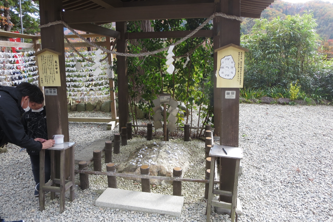 海カメが地面の上に伏せているような形をした甲石は、延命長寿のご利益があるそうです。そういうことが気になる年齢になってきたので、お願いをしてから山門に向かうことにしました。名前を書いた硬貨を甲石の上にお供えしたものです。願い事の種類により甲石のどこに硬貨を置くのか決まっているそうです。傍らには硬貨の置く場所を説明したものがあります。硬貨は神前にお供えされ、祈祷されるそうです。- 旅行時期