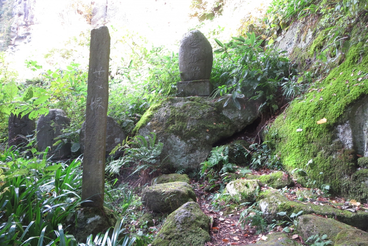- 狭い石段を上り下りする人がすれ違います。せみ塚のある所は階段の折り返し部で少しスペースがあります。