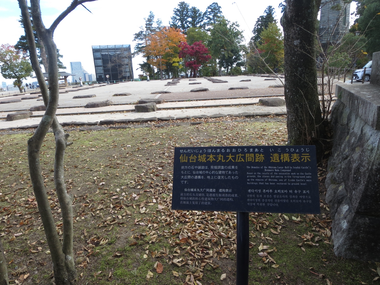 JR仙台駅西口から「るーぷる仙台」という観光客向けの循環バスを利用、30分ほどで仙台城跡まで行きました。仙台城跡は標高130mありますから、「るーぷる仙台」を利用すれば、停留所から平坦な道を数分歩くだけで仙台城跡に着きます。残念ながら3月の福島県沖地震でダメージを受けた伊達政宗公の騎馬像は修復中です。せめてもの心遣いでしょうか、騎馬像前面には騎馬像の写真をコピーした実物大位のシートが張ってありました。これで我慢するしかないですね。他には本丸跡から見る仙台市街地や太平洋の景色が素晴らしいです。また大広間跡の礎石、石垣などを見ました。