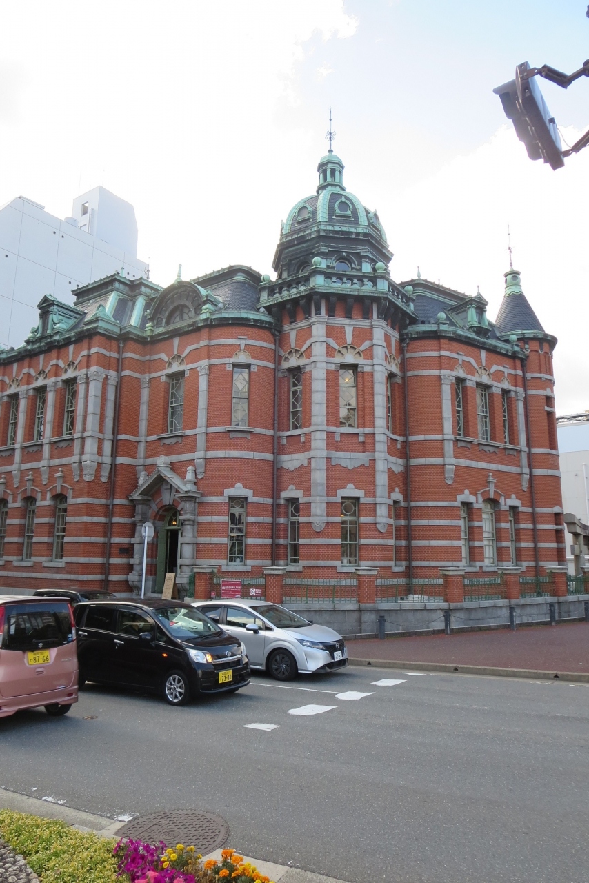 福岡市の中心地天神から中洲方面に歩き、すこし左手には行った所にあります。昭和通りと呼ばれる通りに面しています。この建物規模は大きくないですが、東京駅の赤煉瓦駅舎に似た雰囲気だと思っていたら、辰野金吾さんの設計でした。外観は鮮やかな赤煉瓦に花崗岩お城を配しアクセントにしています。また英国の様式を取り入れていますので、ドームや尖塔があったりします。内部は会議室などに利用されていますが、入館は無料なのでぜひ内部も見てほしいと思います。
