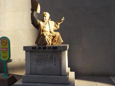 今では知る人も少なくなったオッペケペー節を始めた川上音二郎の像は上川端商店街北口にあります。