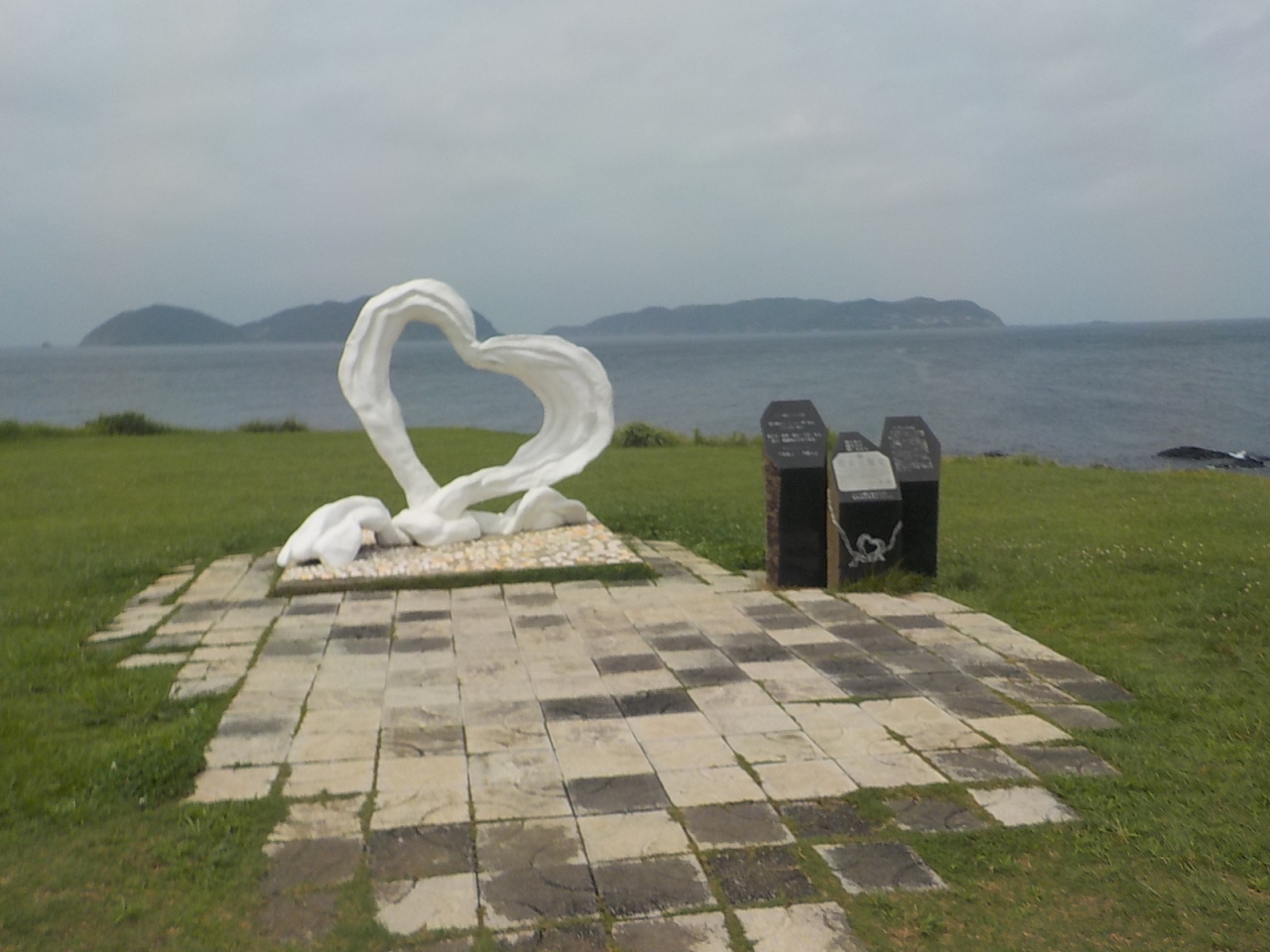呼子の朝市に出かけたので、その後に車で波戸岬まで足を伸ばしました。呼子から15分位でしょう。岬の付け根にはサザエなどを焼いてだべさせる子矢が並んでいます。ここに車を置いて海沿いの道をゆっくりと歩いて行きます。磯沿いの道です。やがて波戸岬の灯台が見えます。その傍らには神社もありますのでお参りしました。帰路は総現状になった道を歩いて行くと海中展望台があり、その横には白亜のハート形のモニュメントがあります。カップルが永遠の愛を誓うのかな?ここからは駐車場までは数分で戻れます。