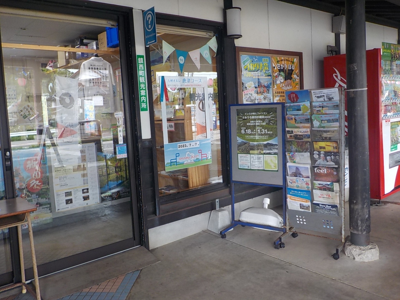 正式名称は「唐津観光協会椿西支所」というそうですが、名称はともかく道の駅天下市の物産販売棟に隣接した形であります。場所は名護屋城跡のすぐ近くで大きな駐車場があります。呼子から車で国道204号線を走ると10分もかかりません。道の駅桃山天下市の駐車場に車を停めて20mほど歩きます。桃山天下市の物産販売棟の一部にこの観光案内所はあります。さっそく周辺の観光案内地図をいただきに入ってみました。係の人は男子で、用件を話すと分かりやすいイラスト風に仕上げた地図を出してもらいました。この地図には浜野浦棚田が載せられていなかったので確認すると手短に分かりやすく説明をしていただきました。応対が親切で気軽に話が聞ける方でした。