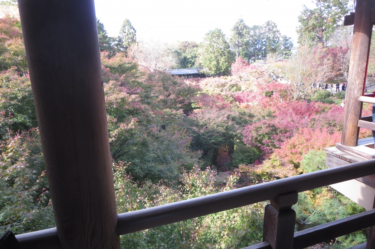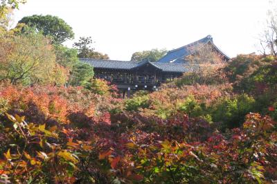 鎌倉時代に創建された臨済宗本山で洛南一の紅葉の名所だと思います。11月下旬は紅葉の見ごろと思って、混雑を避けるために少し早めの平日に出かけました。まだ少し早いですが十分に紅葉は楽しめるかなと思います。境内は一方通行に規制されていて階段を下ったり上ったりして、一番紅葉がきれいに見える本堂から開山堂をつなぐ通天橋に着きます。この場所からの紅葉は洗玉澗の渓谷にある鮮やかな濃い赤の紅葉が見られます。
