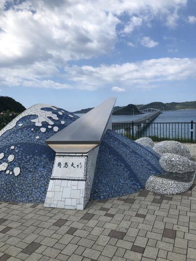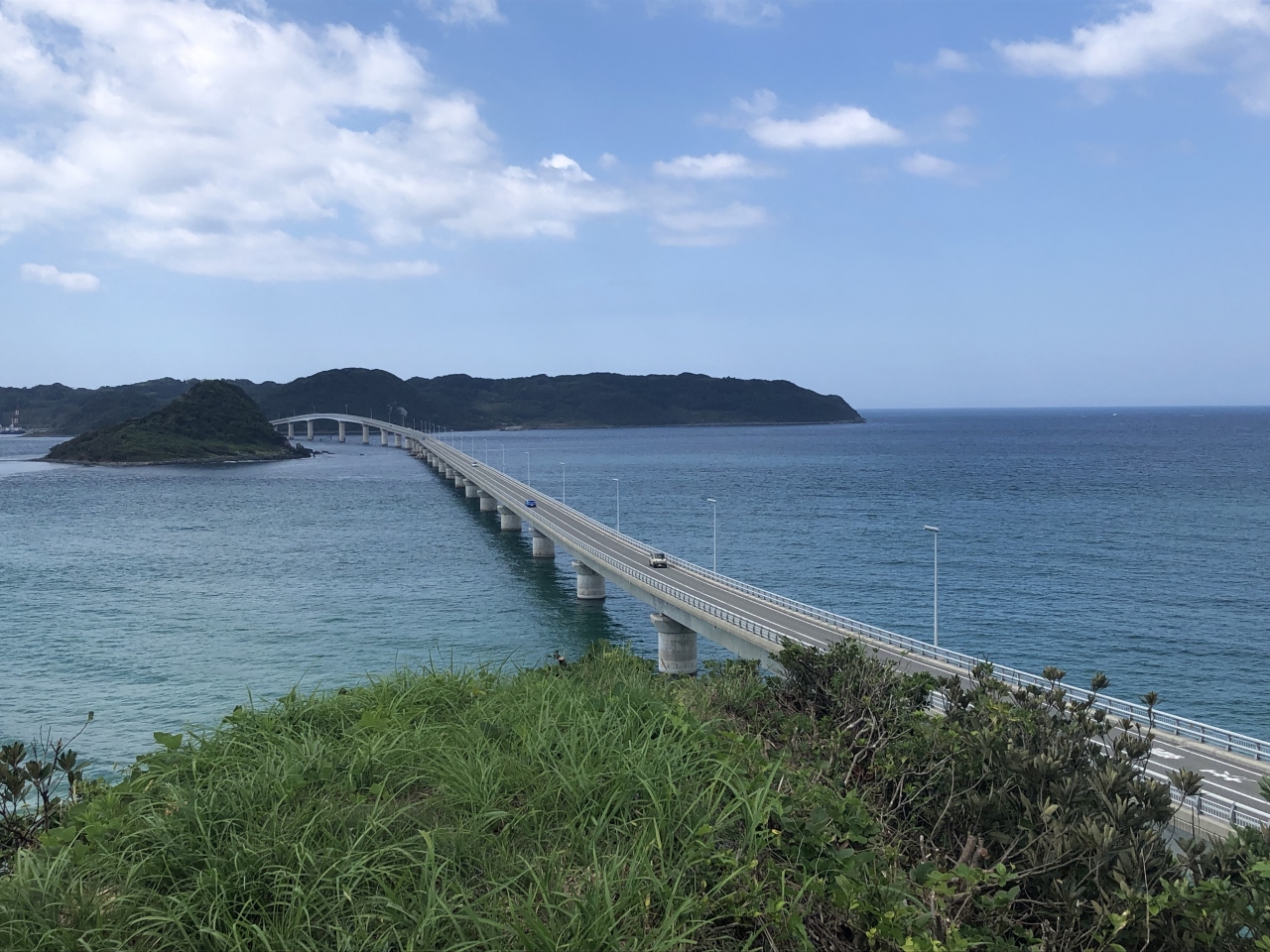 真っ白な角島大橋と日本海のコバルトブルーの海の色のコントラストがきれ観光スポットです。
