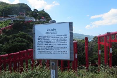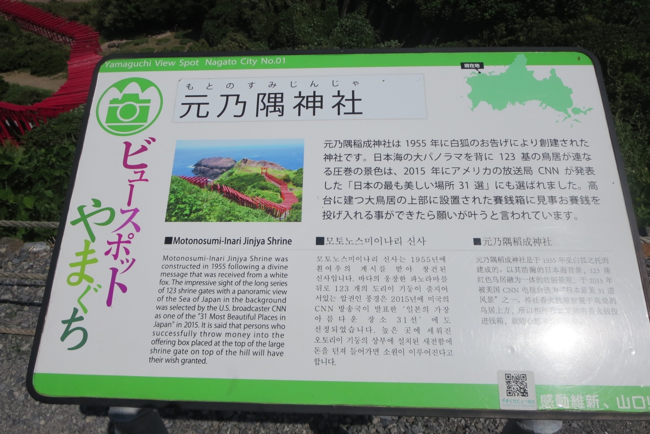 中国自動車道美祢ICから車で1時間少しかかりました。週末や祝日はアクセス道路が狭いので混雑すると予想して平日にいきました。それでも駐車場はほぼ一杯でした。幸い待たされることもなく入れました。元乃隅神社は真っ赤鳥居123基が高台から海に向かって建てられていて、コバルトブルーの日本海のコントラストが鮮やかなところです。、パワースポットとしてもインスタ映えも抜群の場所です。駐車場から参道に入った所にある大鳥居は地上5~6mの所に賽銭箱があります。お賽銭をが入れば願いが叶うそうで多くに人がトライしていました。高台から真っ赤な鳥居の参道を下りて行くと、広場になりますがその右手の急峻な岩場では海水が吹き上がる「竜宮の潮吹き」を見ることができます。まず吹き出し口を見つけて、カメラを構えて辛抱強く待つしかないです。