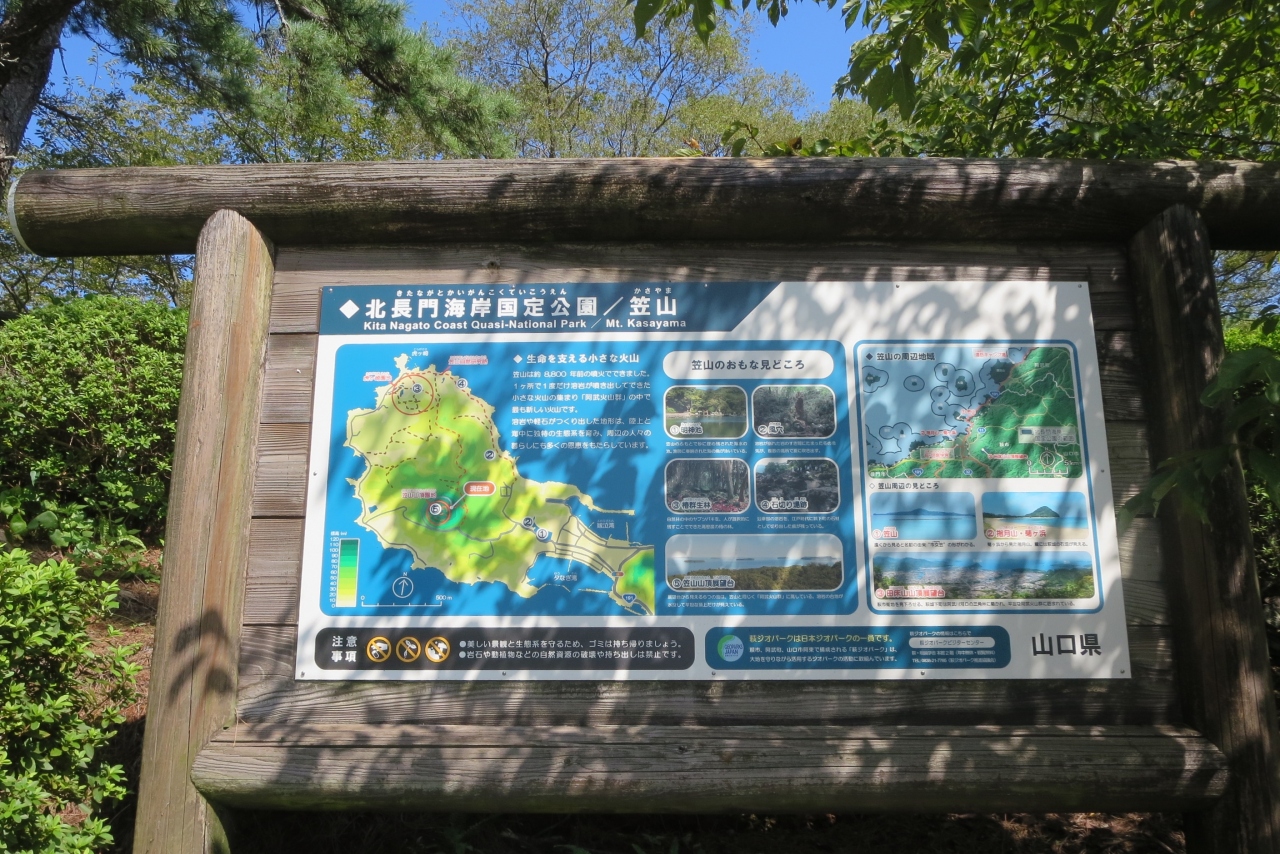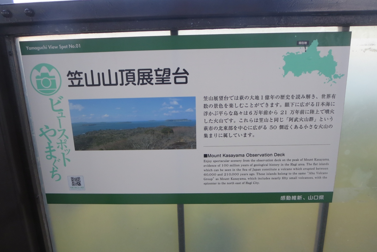 萩市の北方向にある半島のようなところにある標高112m山です。山頂には小さな噴火口がありますが、火口内はうっそうとした木にに大半は隠されていてよく見えません。約1万年前に噴火し、安山岩の溶岩台地のようなところから「笠山」と名付けられたように思います。頂上には立派な展望台があり、日本海に浮かぶ平らな形をした島々がよく見えます。萩市内も遠くになりますが見えます。