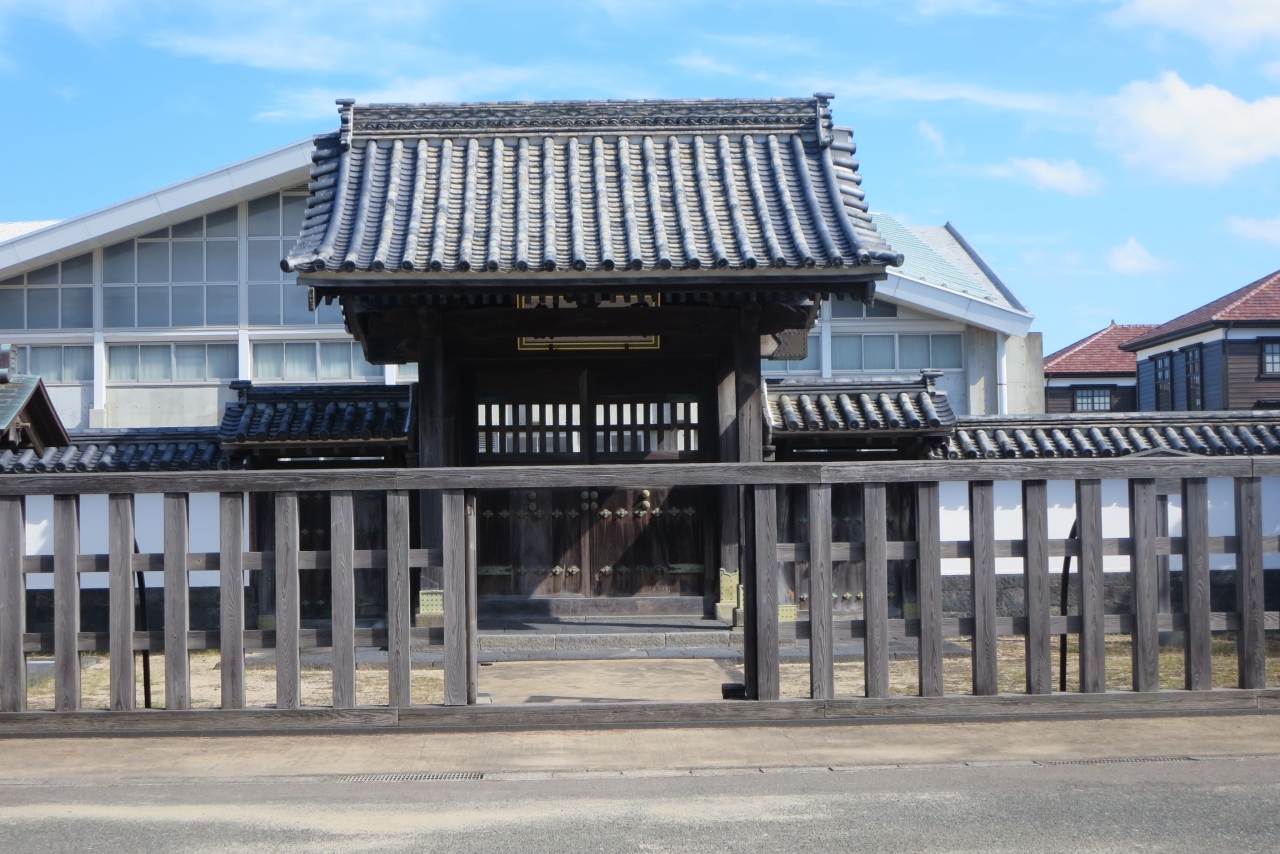 元は藩政時代にあった門で、萩の城下町から萩城三の丸への出入り口でした。現在の門は20年ほど前にケヤキ材を使って復元されたものです。藩政時代は昼間は門番がいて、人の出入りを監視していました。夜間は閉門されていて許可を受けた人のみが通行できたようです。復元された門はかなり大きな門で、片側には小さな出入り口もあり夜間の通行に使用したものと思います。