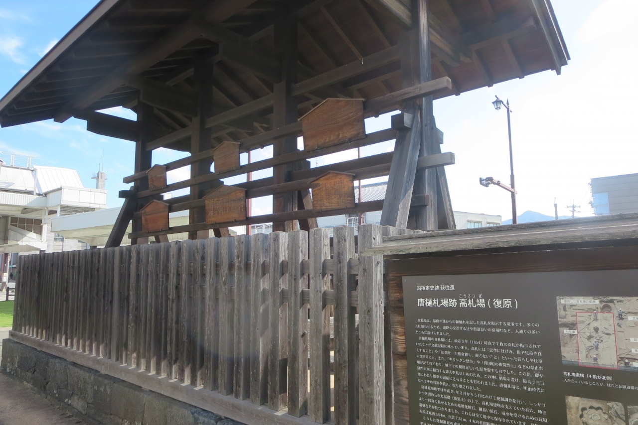 高札場とは当時の幕府や藩主が決めた法度やお触書、掟書などを板に書き、人目を引くように交通の要所に高く掲げておく場所のことです。いまでいう掲示板で、江戸時代にはこのような方法でしか民衆に知らせる方法がなかったんでしょう。そういう意味では、この場所は萩と防府三田尻を結ぶ萩往還の起点となる場所で、交通の要所なので皆さんの目に触れやすい場所した。また周防や長門の一里塚の基点にもなっていました。