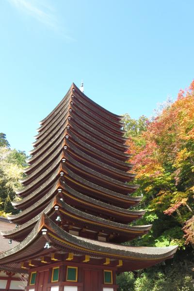 JR桜井駅から談残神社行バスで終点まで乗ると到着します。藤原鎌足が中大兄皇子と蘇我入鹿を暗殺するために談合をしたと言われるの山が神社の裏にあります。この神社も紅葉が見事ですが、まだ有名になっていないようで訪れる方は少ないようです。多武峰にある神社ですが、重要文化財の楼門、本殿、権殿などが並んでいます。ただ一つ残る木造十三重塔は藤原鎌足の墓塔だとされています。