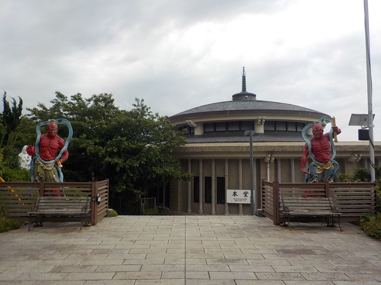 約30年前に建てられた高野山別真言宗最福寺(鹿児島県)の院です。江の島の最も高い所まで上がってくると、江の島シーキャンドルとで往路を隔てたところに目にも鮮やかな真っ赤な仁王像あります。この仁王像に守られるようにして建つ山門を入ってみると、お寺とは思えないような洋風美術館のような本堂があります。本堂内には屋内の像としては国内最大、高さ6mの赤不動像がご本尊として祀られています。