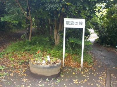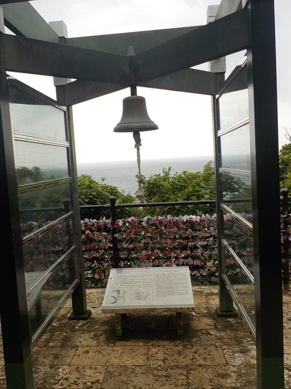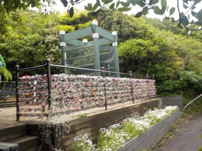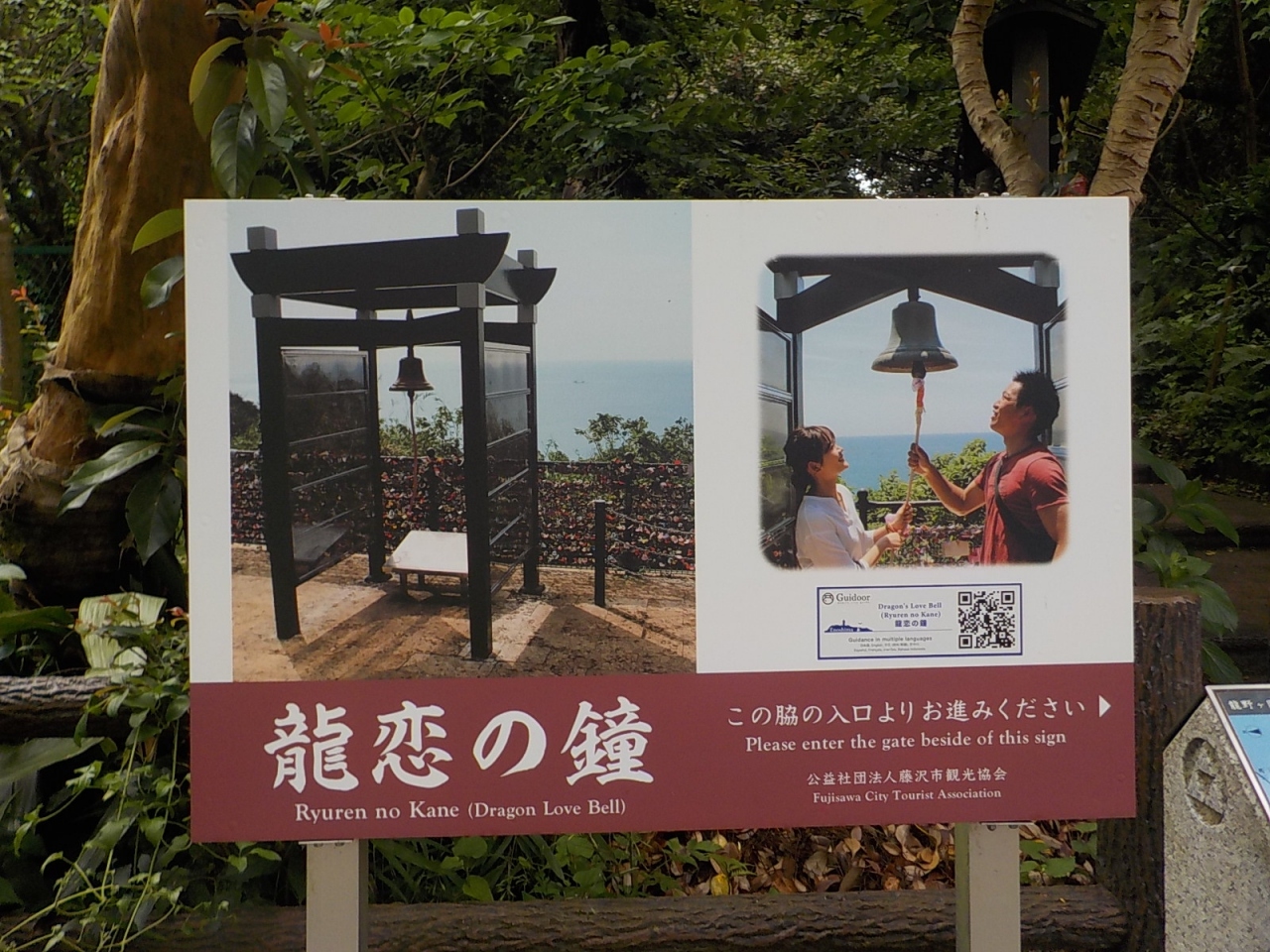 江ノ島の「天女と五頭龍」の恋物語伝説にもとづいてつくられた観光スポットです。場所は江島神社奥津宮からすこし左手に行った所から低木の間にある細い道を歩いて行きます。2分も歩くとこの鐘を吊り下げたデッキのようなものがあります。恋愛成就を願うカップルが訪れて鐘を鳴らしたり、デッキのフェンスにある網の柵に永遠の愛を誓うようにしてカラフルな南京錠が付けらっれています。この日はあいにくでしたが、晴天の日には伊豆大島が望める展望の用意場所になります。