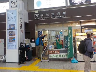 JR小田原駅に到着して改札口の目の前にあるこの観光案内所を見つけ、まず最初に訪問しました。観光案内所は広くないので、中に入らず順番待ちをしていたらボランティアの方が声をかけてくださいました。非常に気さくな方で、希望する訪問先は小田原城と伝えたら、小田原城にせっかく行くなら、東側の「お堀端通り」の正面入口(馬出門)から入って、住吉門と銅門を通って行くのがよいと教えてもらいました。もし時間があれば報徳二宮神社に参拝してから天守閣に行くのがよいとも付け加えられました。小田原駅に戻るのは北入口から出ました。ネットや観光案内書だけでは分からない情報を的確に教えていただき助かりました。