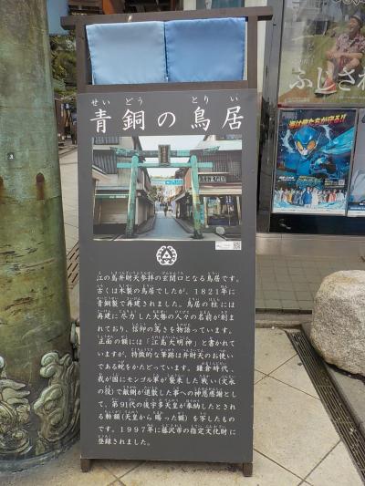 江の島に架かる弁天橋を渡った所にあります。江の島は弁財天信仰の地ですが、その象徴となる青銅の鳥居です。1747年(延亨4年)に創建されましたが、現在の鳥居は1821年(文政4年)に再建されました。海のそばにあるのですが潮風の影響を受けているはずですが、しっかりと建っています。この鳥居からは江島神社への参道となり、弁財天仲見世通りという土産物屋や旅館、食べ歩きのできそうなお店が並んでいます。