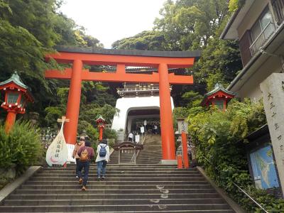 - 江島神社奥津宮からだけでも割合急な階段を200段以上下りて行きます。帰りはこの階段を上がります。