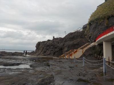 江島神社の辺津宮、中津宮、奥津宮を経て稚児ケ淵まですべて徒歩で行きました。約1時間近くかかりました。中津宮までは階段や坂道を上ります。江ノ島の最も高いあたり(シーキャンドルがあります)あたりからは階段を下りたり上ったりして奥津宮に着きます。ここからは急な階段を一気に海岸線まで下ります。200段以上の階段は勾配もありますので、帰りは上らないといけないことを考えて行動してください。階段途中で一気に景色が開け海岸線の景色を楽しめます。波食台のような平らな岩が続きます。稚児ケ淵の名の由来は鎌倉相承院で修行していた稚児白菊が身を投じたたことによるそうです。海岸線は歩くことができますが並みの高い日には立ち入り禁止になるようです。十分ご注意ください。
