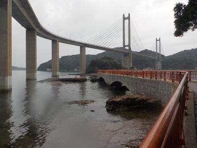全長728mのプレストレストコンクリート斜長橋です。2つの主塔で支持されていますが、主塔間は250mあり、下は航路を確保するために海面迄30mの高さがあります。加部島自体は観光地というほどではないですが、田島神社に向かうためにこの橋を利用しました。通行料は無料です。殿ノ浦側には駐車場があります。駐車場から階段を下りて行くと呼子大橋の下には呼子大橋に沿うようにして長さ約200mの弁天遊歩道があります。ここから橋を見上げると主塔が100m余りありますので大迫力です。