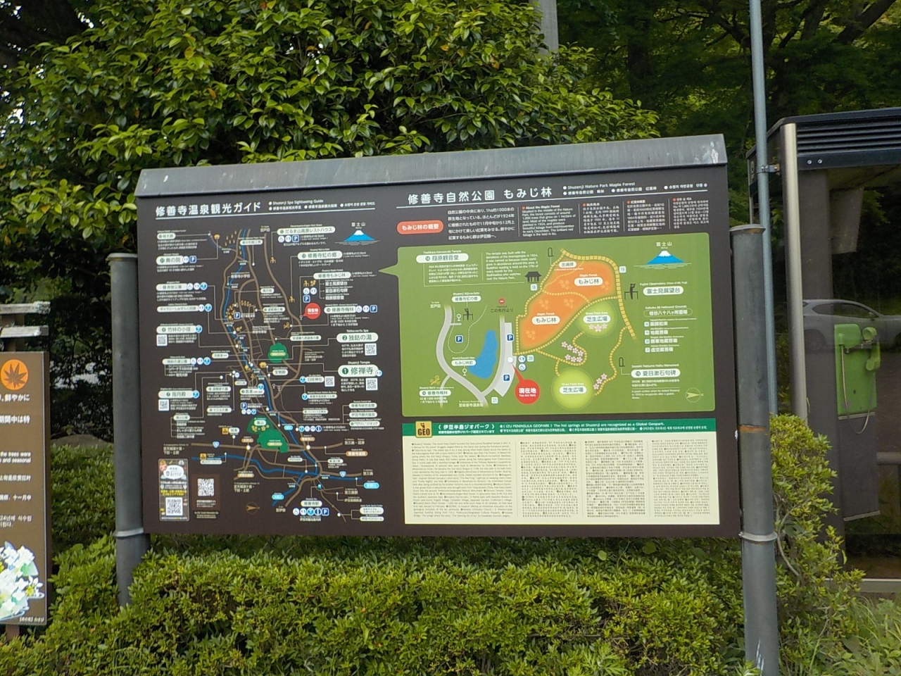 修善寺自然公園には虹の郷、もみじ林、梅林などがあり、今の時期は鮮やかな新緑が楽しめます。駐車場は紅葉の季節には有料になるようですが、今回は無料で利用できました。園内を散歩しましたが、天候があまりよくなく、富士見台からの富士山展望は断念したので、残念でした。また園内の各所には「ダニが発生しているので遊歩道以外には入らないように」という注意書きがありました。マダニは怖いからご注意ください。