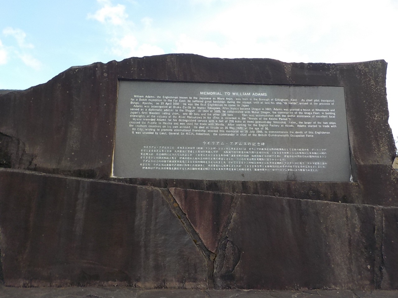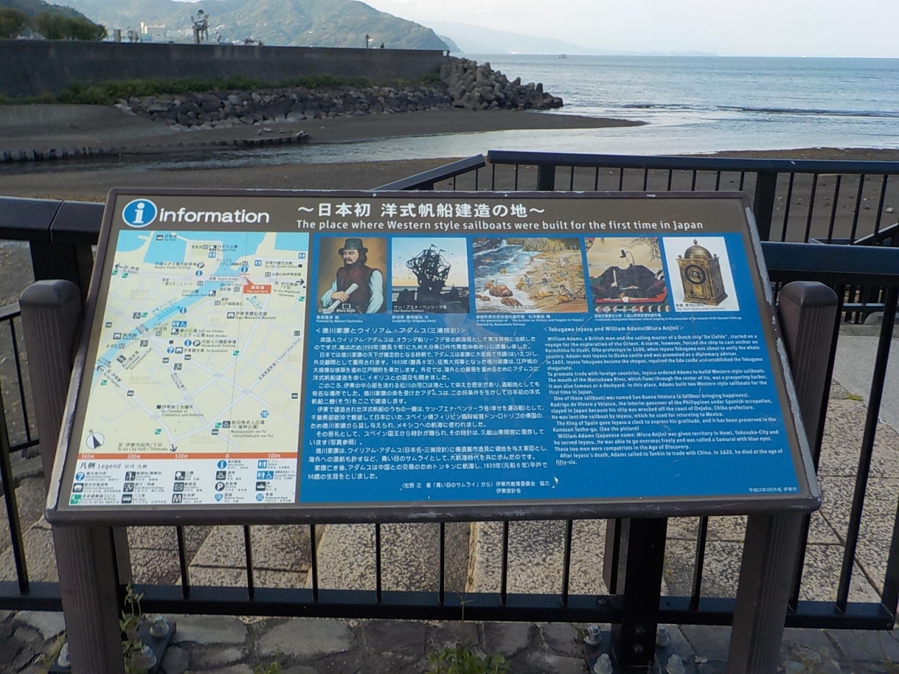 伊東温泉のなぎさ公園から国道沿いに南に行くと広場があって、三浦按針の胸像と按針が指導して建造した洋式帆船が並んでいます。また按針碑は松川の河原に下りて行くとすぐに分かります。三浦按針(ウィリアム・アダムス)は英国人で、オランダ商船の水先案内人をしていましたが、1600年に九州に漂着します。その後、徳川家康に信頼されるようになり、三浦按針と名乗り徳川家康の外交顧問になっています。