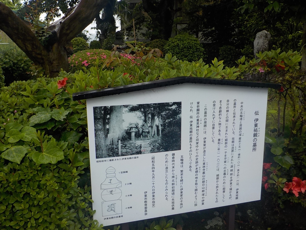 藤原家を祖先とする伊東一族は伊豆半島の頭部に勢力を持っていました。伊豆に流された源頼朝の身柄を預かっていましたが、頼朝は伊東祐親の娘八重姫と恋仲になり、二人の間に産まれた子を殺害するという決断をすることになってしまいます。源平合戦で源頼朝から源氏側に寝返るよう言われますが、平氏への忠誠を尽くす姿勢は変わらず自刃したと伝えられています。墓はそれほど大きなものではない五輪塔で、胸の高さ位のものです。周りの植栽がきれいに管理されていました。